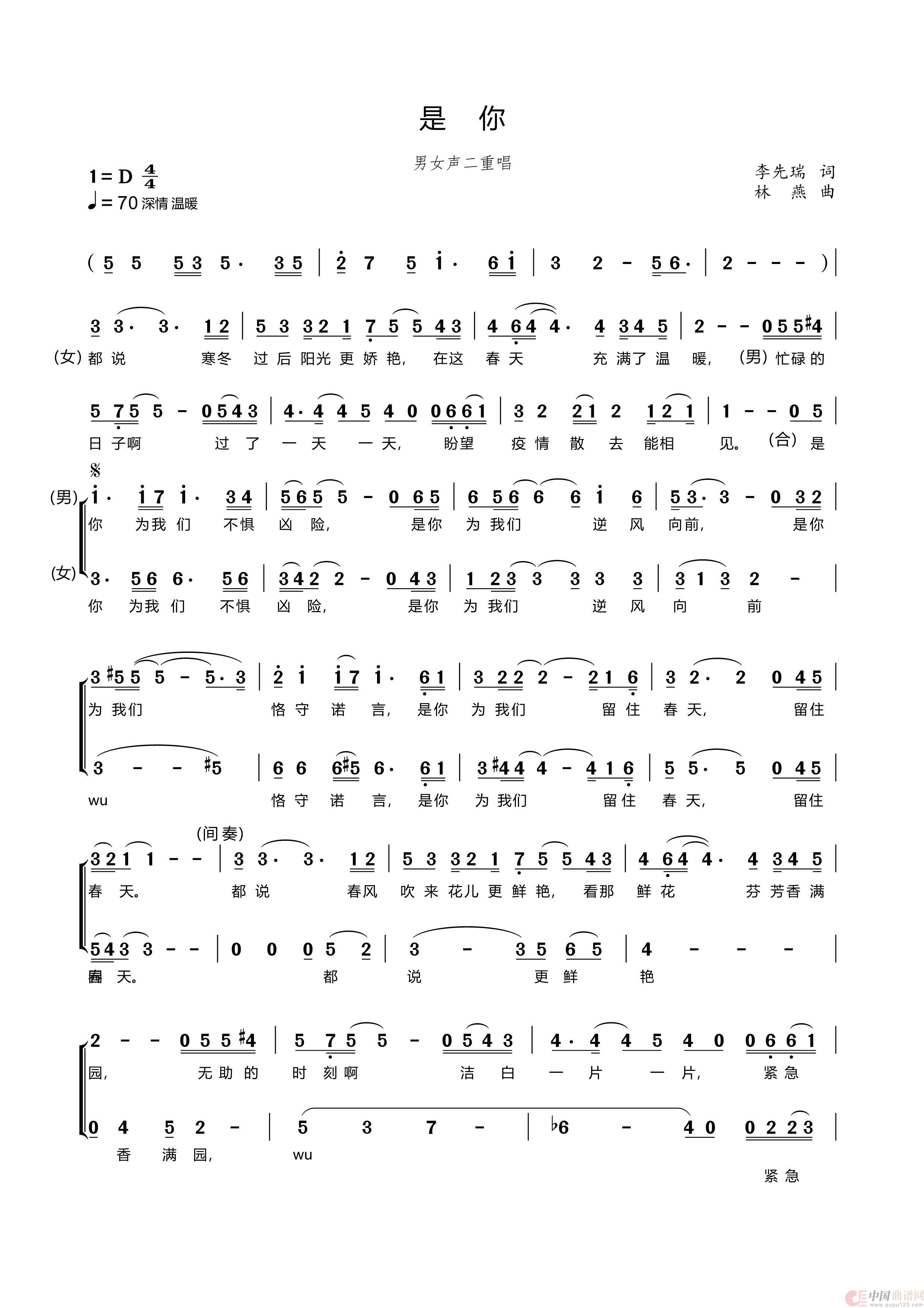 是你(男女声二重唱  李先瑞词 林燕曲)(1)_原文件名:是你(男女声二重唱)_Page1.jpg