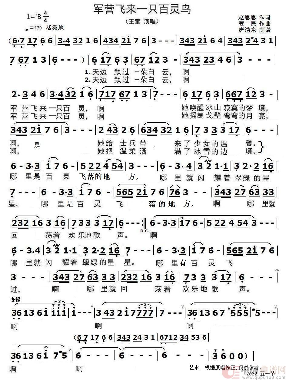 当前位置: 首页 谱友园地 谱友上传 军营飞来一只百灵(根据原唱修正)