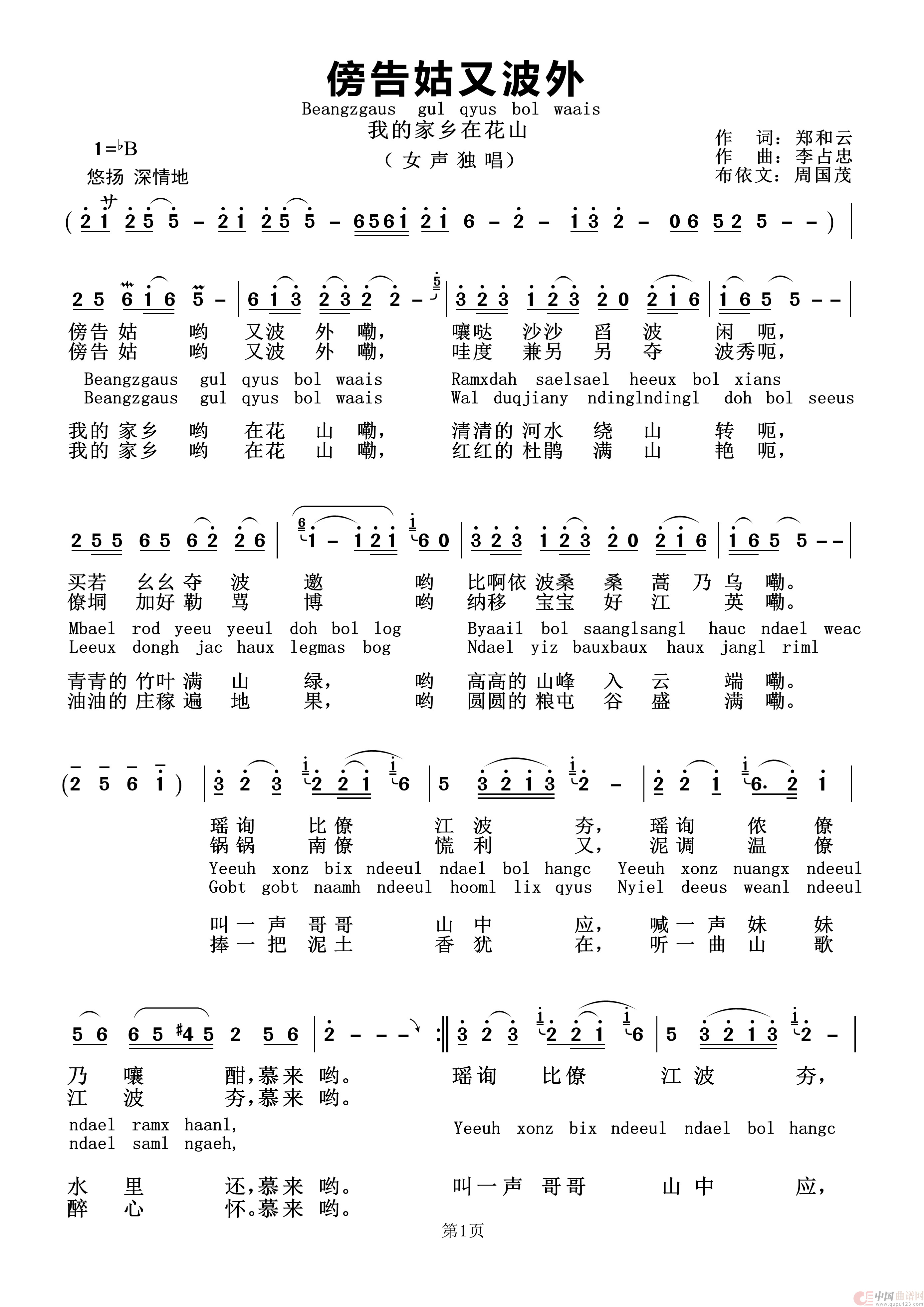 歌曲《Beangzgaus gul qyus bol waais》(布依语,汉语为:我的家乡在花山)采用贵州省西南部布依族民间音调作素材,呈现出人在花中走,花与人同醉的自然景观和人文景观。
