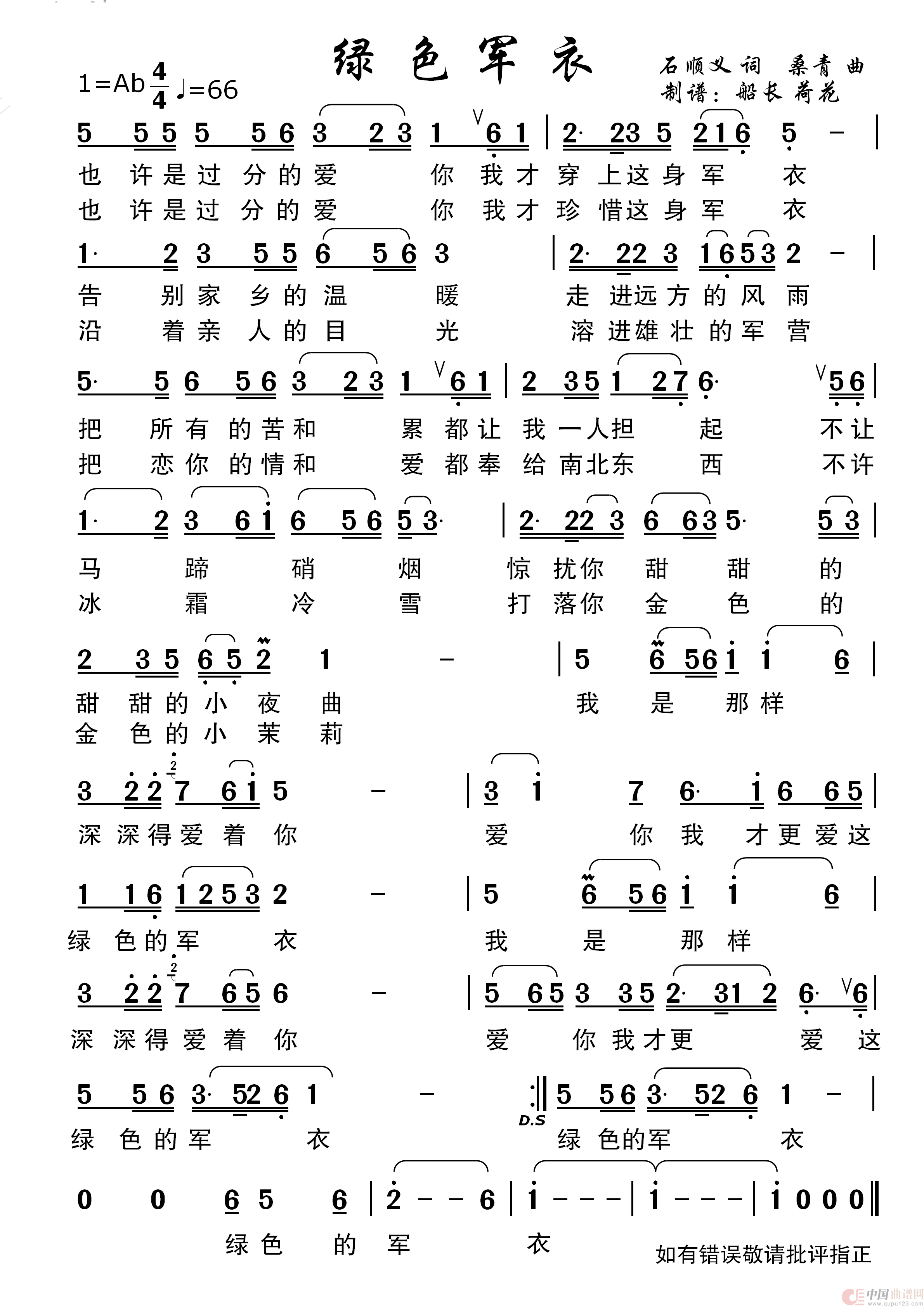 关于《绿色军衣》曲谱的评论