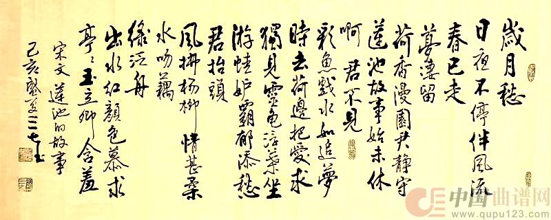 该曲谱婉转悠扬,旋律和歌词都包含了对远方妻子的情感思念,音乐表达也亦诗亦词,仿佛能看到作者独自徘徊和吟诵的身影和愁绪,歌词意境具有较强的画面感!