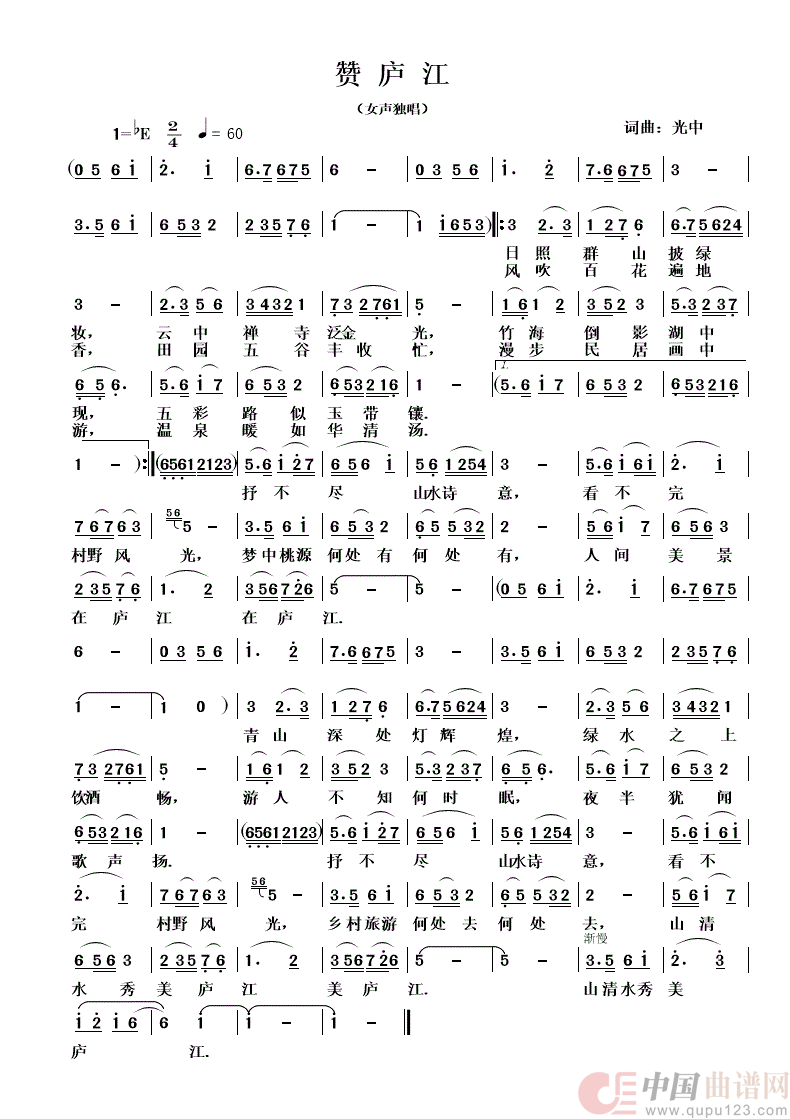 《赞庐江》是“庐江三曲”的第二曲,是庐江三曲中相对较规范的作品,该曲歌词赞美了庐江的特色美景,曲调优美、磅礴,反映了作者对家乡的无比热爱、眷念,是赞美庐江的一首难得的歌曲。庐江三曲同时制作了短视频,很多人看后都称赞是图、词、曲的完美统一,短视频发表于《抖音》中,注册账户名为“庐江光中”,欢迎观赏。 [回复]