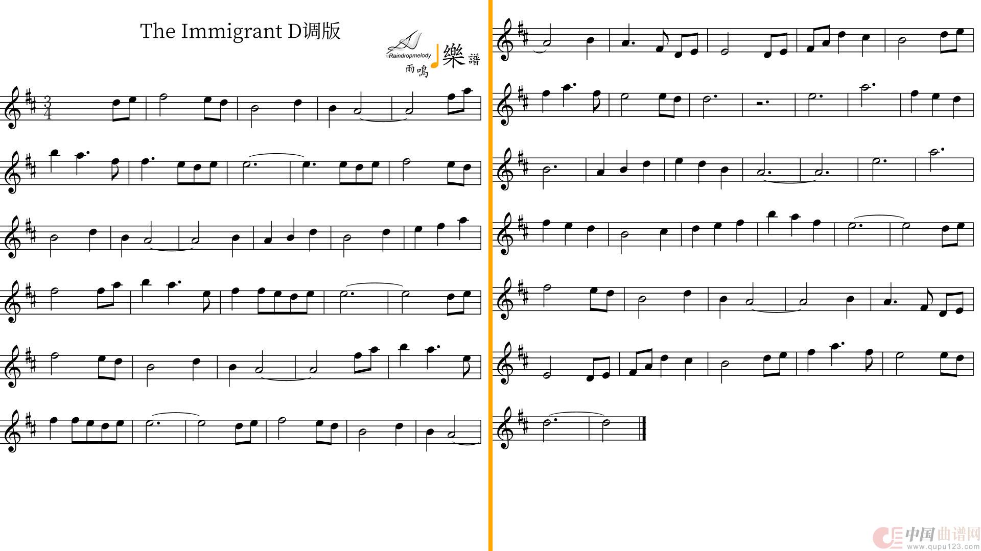 The Immigrant根据Joanie Madden专辑《Song Of The Irish Whistle》版本打谱,Joanie Madden使用C调哨笛演奏,这里按照更常见的D调哨笛打谱。