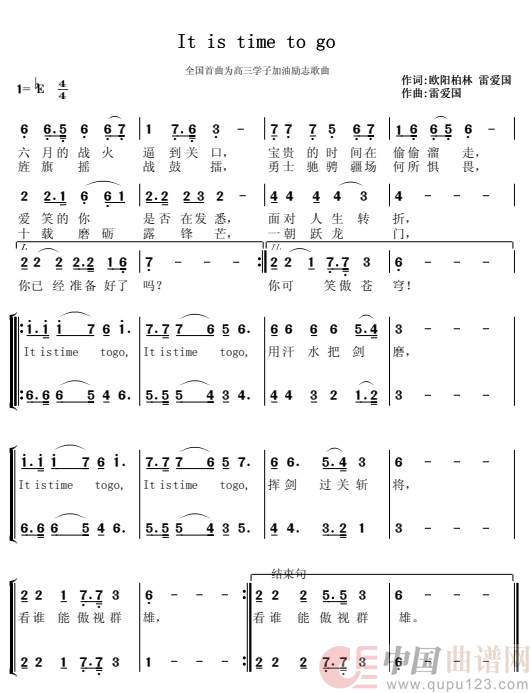 六月的战火逼到关口,宝贵的时间在偷偷溜走,爱笑的你是否还在发愁?面对人生转折,你已经准备好了吗?旌旗摇,战鼓擂,勇士驰骋疆场,何所惧畏,十载磨砺露锋芒,一朝跃龙门,你可笑傲苍穹?It is time to go It is time to go 用汗水把剑磨,It is time to go It is time to go 挥剑过关斩将,看谁能傲视群雄!