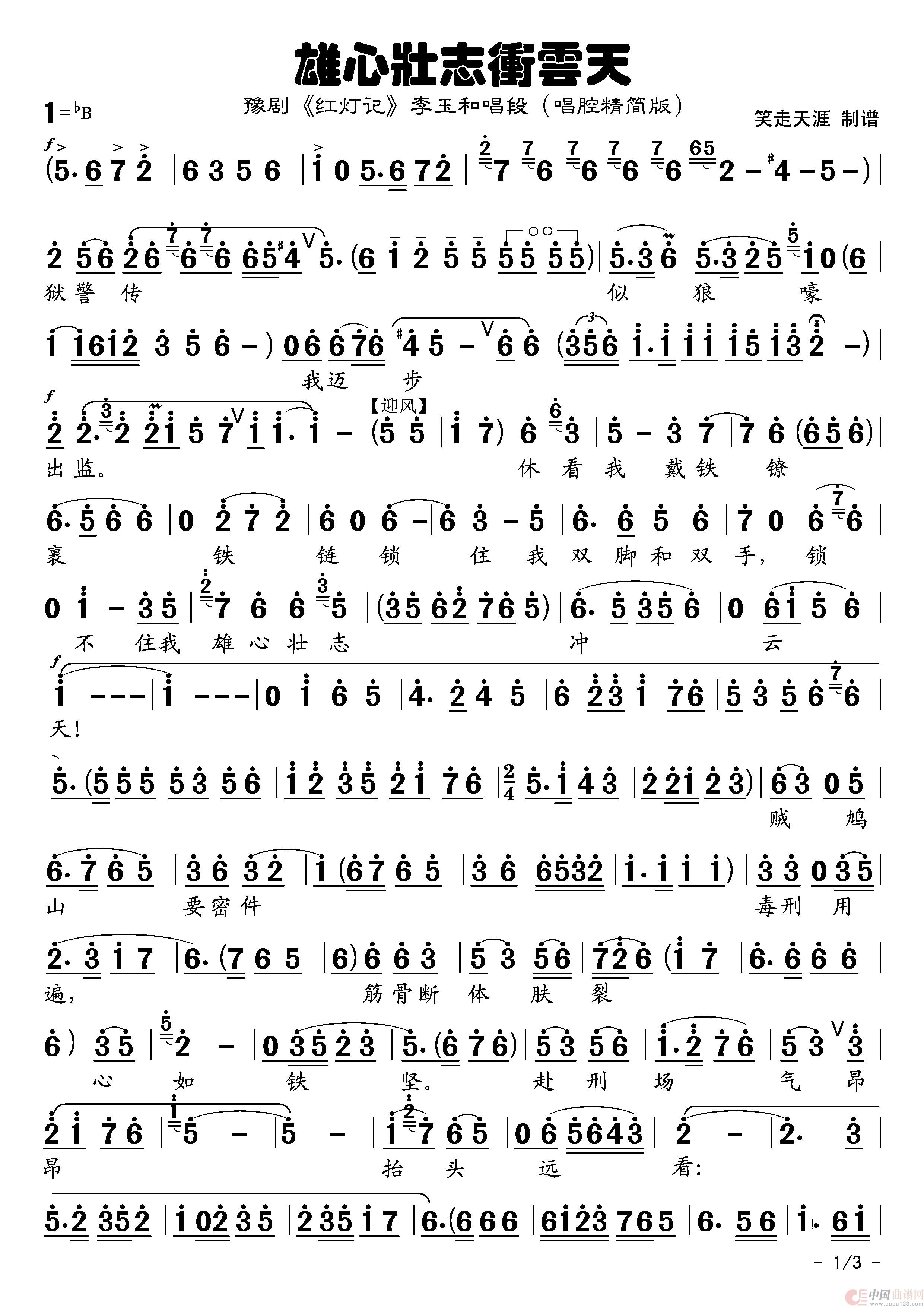 豫剧曲谱《雄心壮志冲云天》<精简版>(《红灯记》李玉和唱段)
