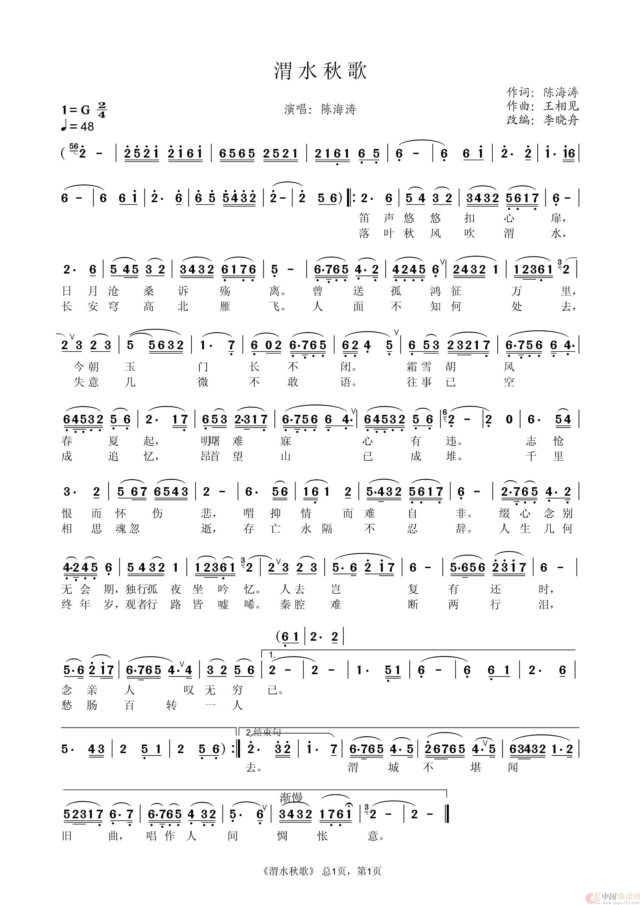 关于《渭水秋歌演唱版词谱》曲谱的评论