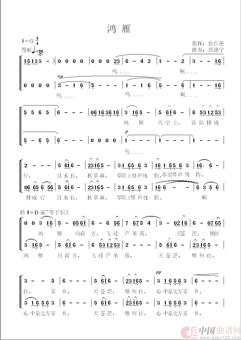 鸿雁 合唱谱 国家大剧院合唱团简化版 郅康宁改编(鸿雁 (国家大剧院合唱团简化版)合唱谱 郅康宁 )