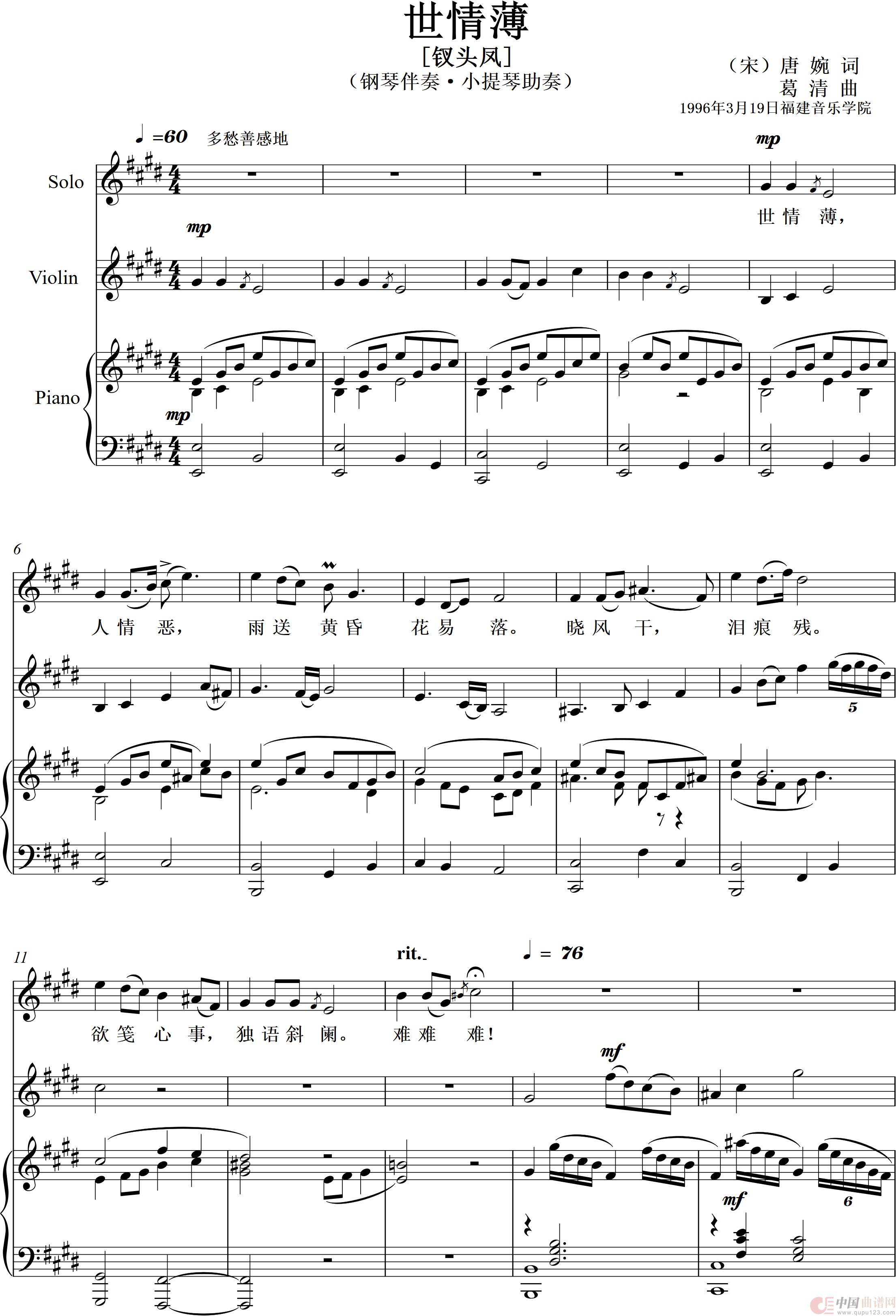 关于《世情薄(钗头凤)》曲谱的评论
