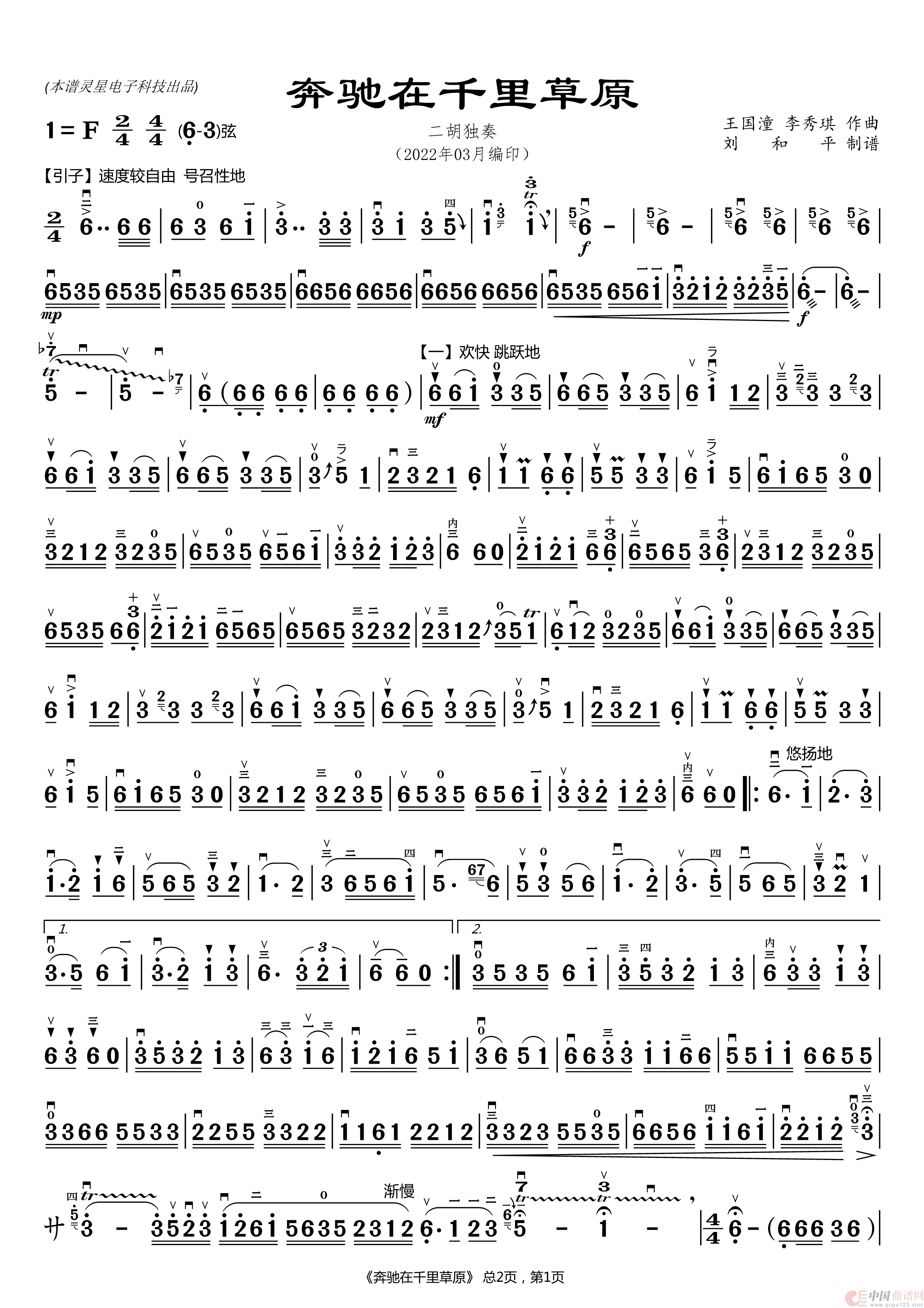 奔驰在千里草原(二胡曲谱 刘和平制谱)
