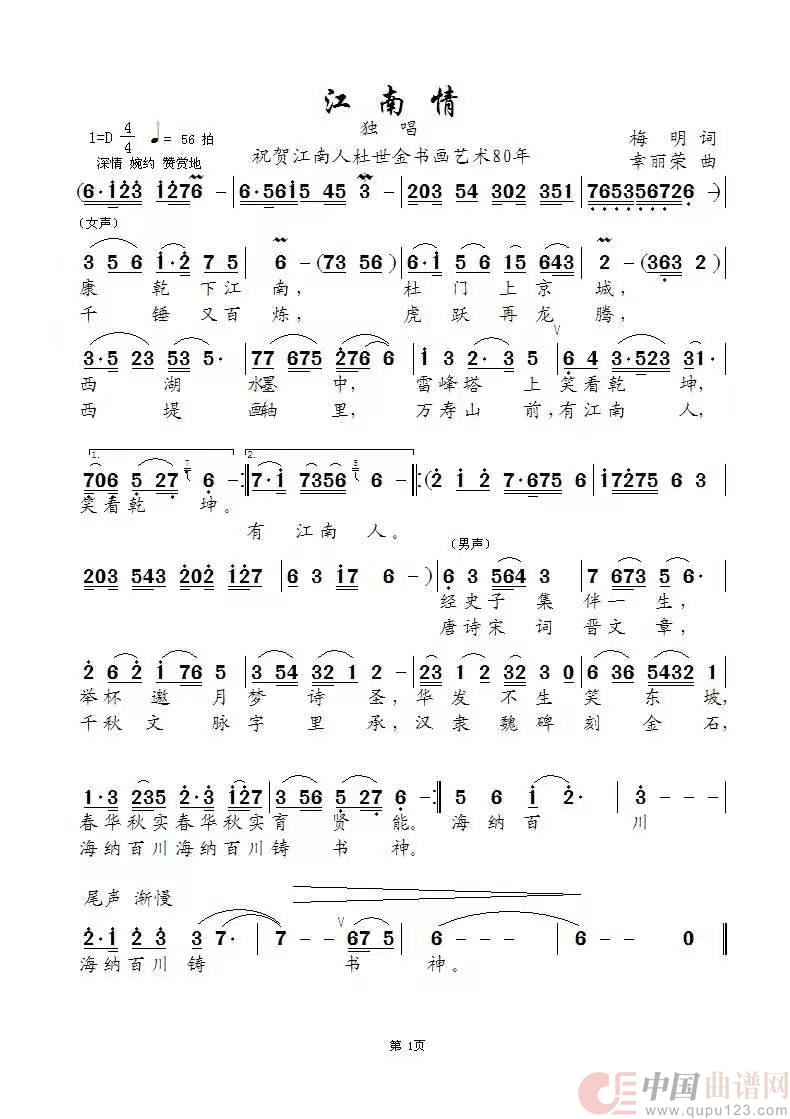 而曲作者幸丽荣女士可谓以艺术的眼光和心境与歌词产生了共鸣,并以高水准的专业能力用美妙的旋律将歌词再度演绎,上半阙她用江南小调符合江南特征,下半阙回到颂歌节奏符合北京特点。本来这二者不太好协调,却被歌手李庆芳空灵清亮的嗓音演唱得天衣无缝。