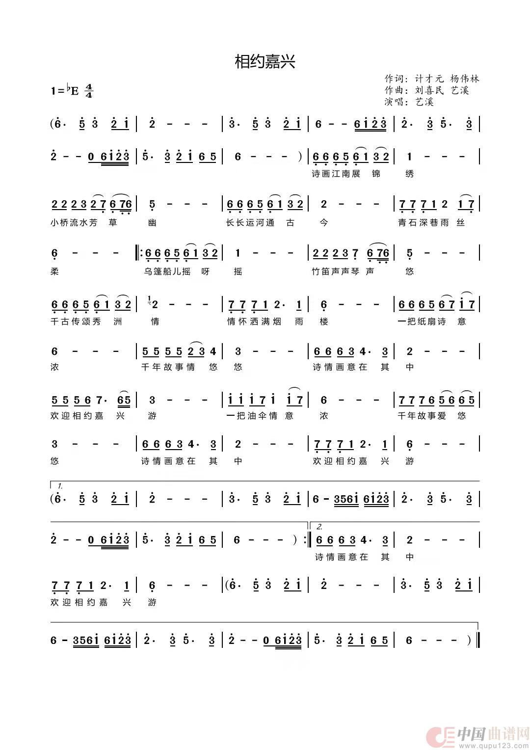 《相约嘉兴》 作词: 杨伟林 计才元 作曲:刘喜民 艺溪 演唱:艺溪 编曲:艺溪 王达 录音/混音:重鱼 音乐监制:庄子 诗画江南展锦绣 小桥流水芳草幽 长长运河通古今 青石深巷雨丝柔 乌篷船儿摇呀摇 竹笛声声琴声悠 千古传颂秀洲情 情怀洒满烟雨楼 一把纸扇诗意浓 千年故事情悠悠 诗情画意在其中 欢迎相约嘉兴游 一把油伞情意浓 千年故事爱悠悠 诗情画意在其中 欢迎相约嘉兴游 乌篷船儿摇呀摇 竹笛声声琴声悠 千古传颂秀洲情 情怀洒满烟雨楼 一把纸扇诗意浓 千年故事情悠悠 诗情画意在其中 欢迎相约嘉兴游 一把油伞情意浓 千年故事爱悠悠 诗情画意在其中 欢迎相约嘉兴游 诗情画意在其中 欢迎相约嘉兴游关于《相约嘉兴》曲谱的评论