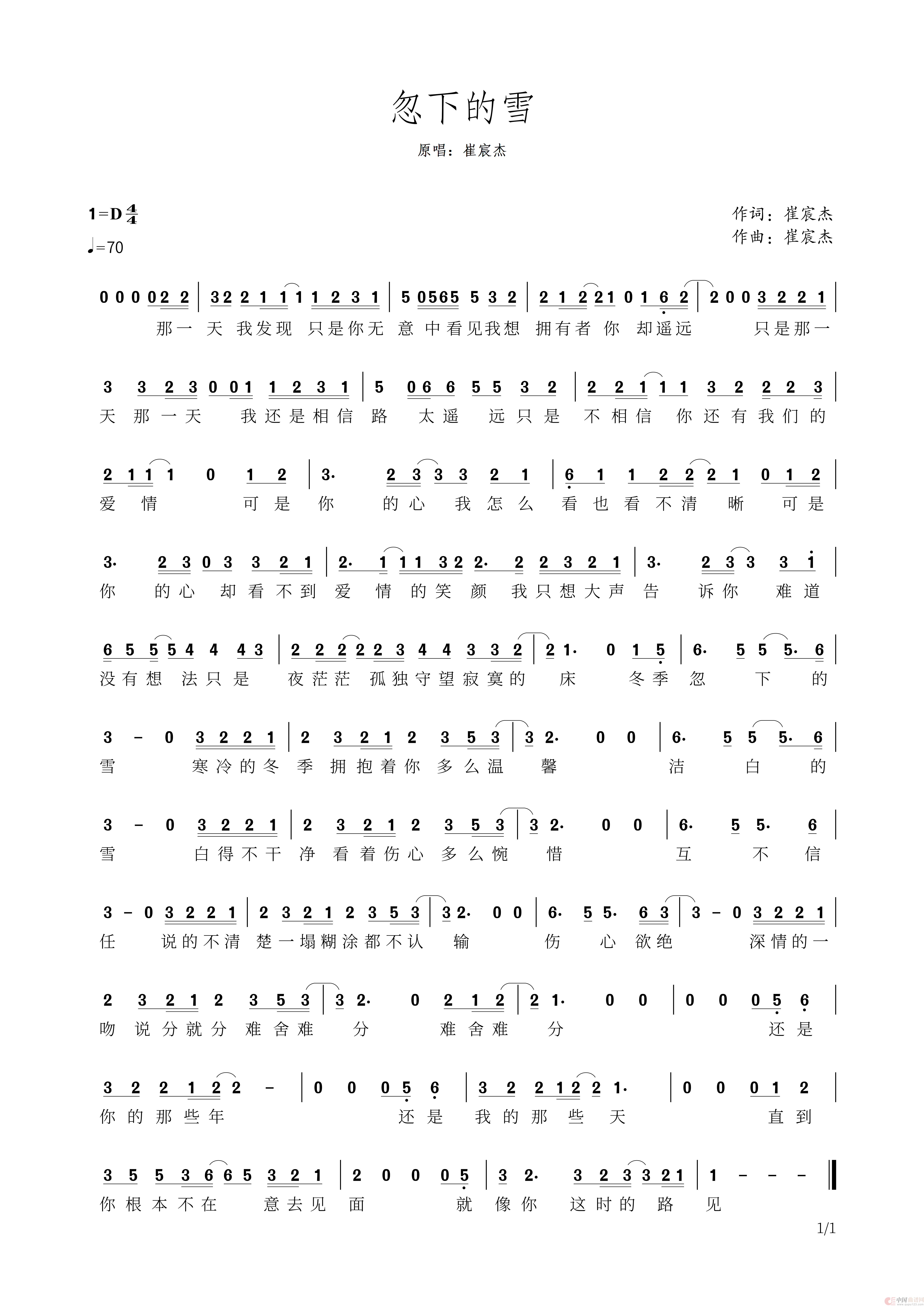 华语流行乐男歌手崔宸杰的歌曲《忽下的雪》歌谱简谱。