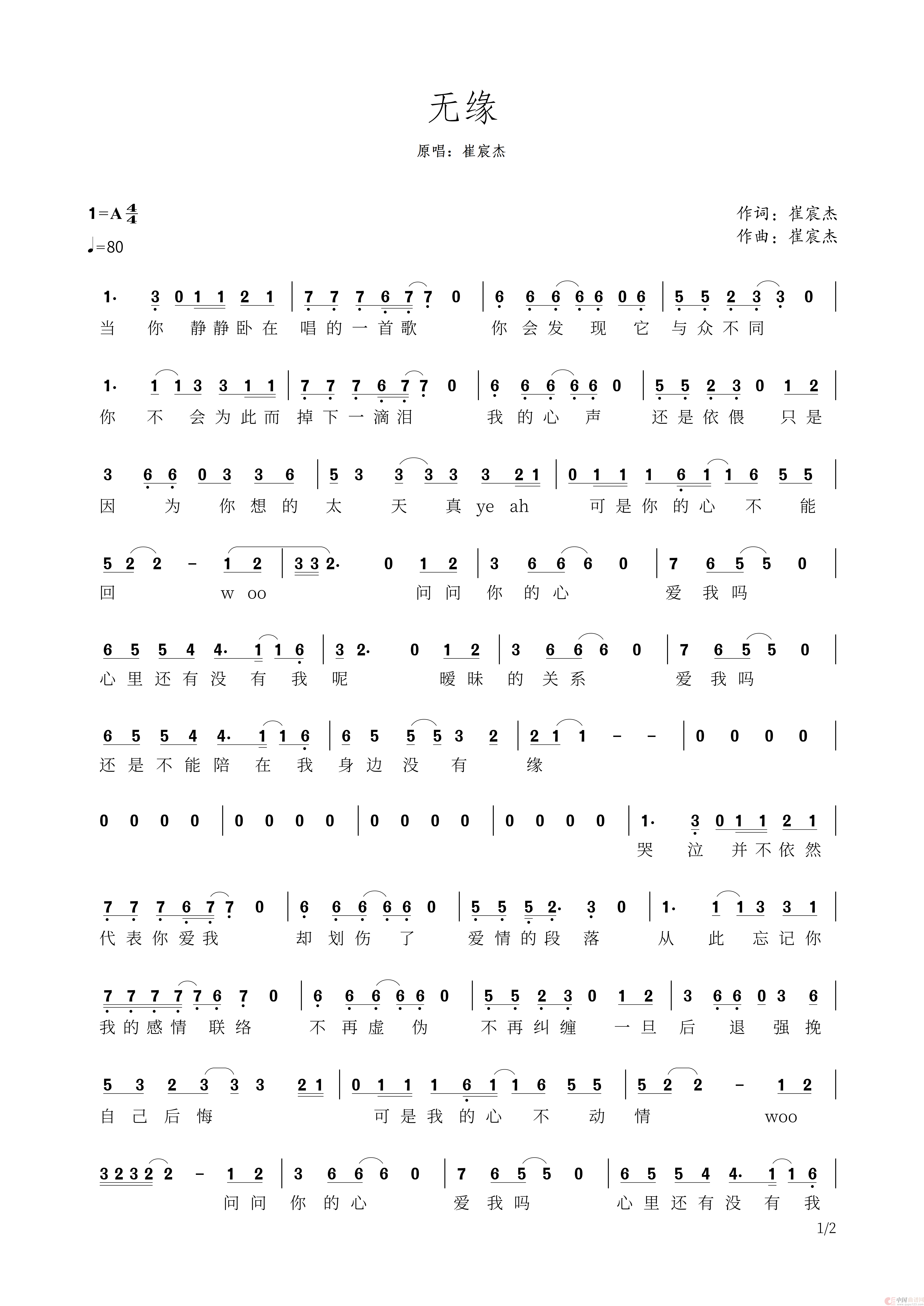 关于《无缘》曲谱的评论