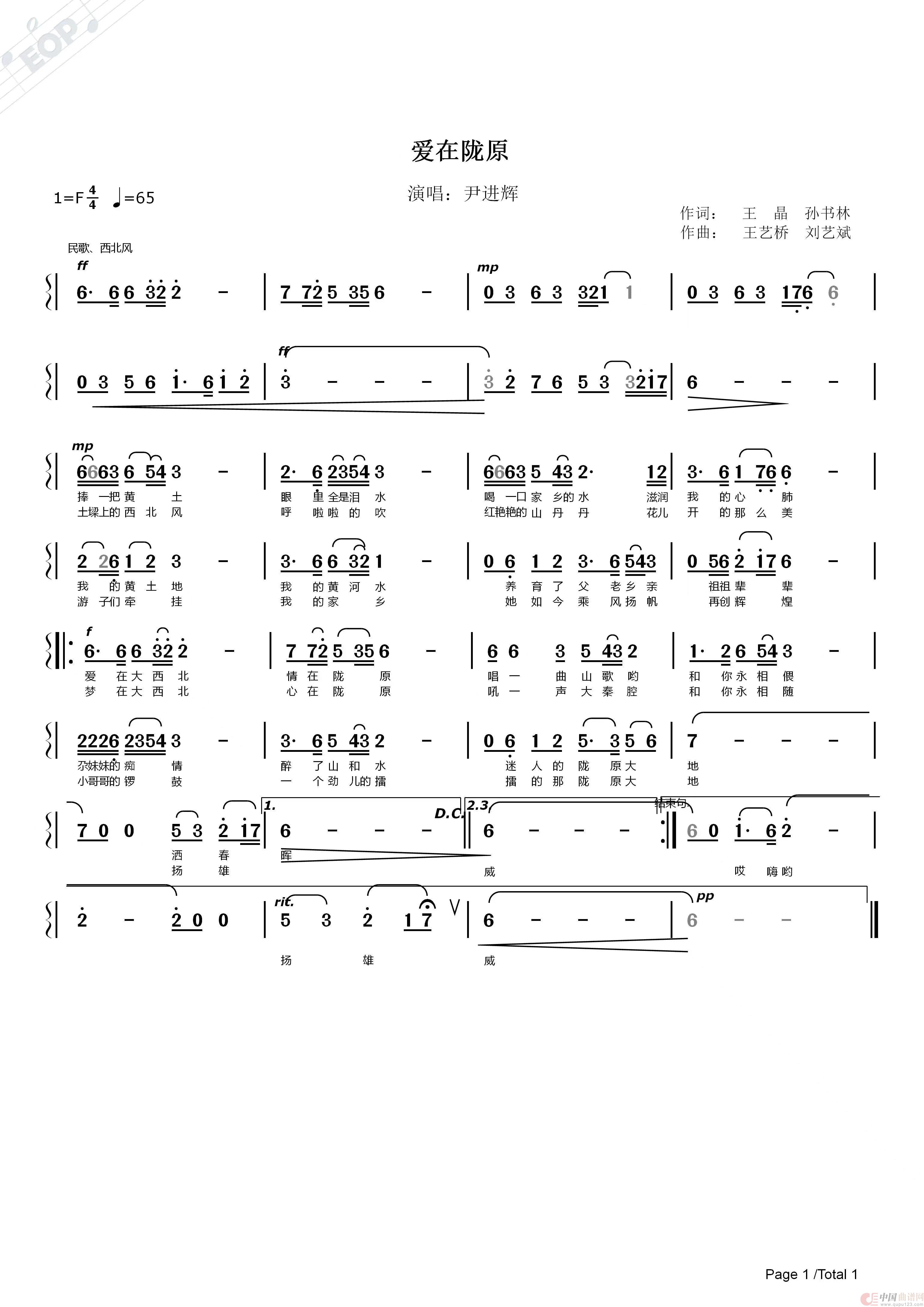 尹进辉-爱在陇原 简谱