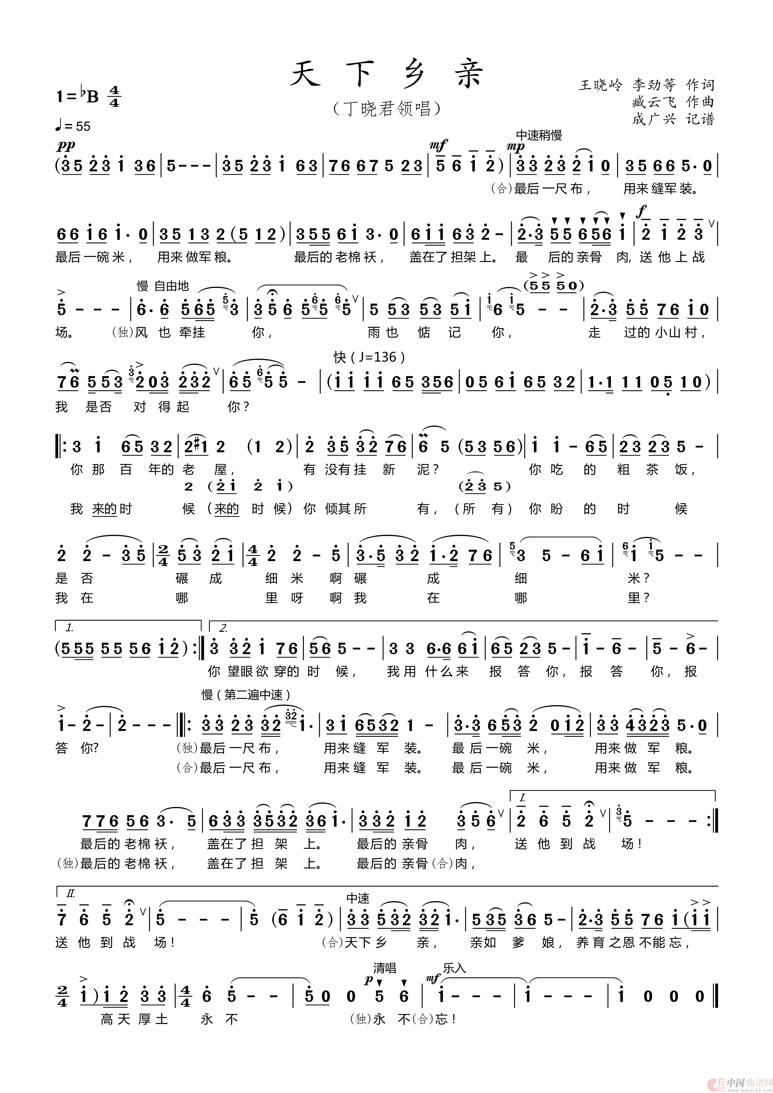 《天下乡亲》(修改版)纠正了先前上传的简谱中某些节奏问题和前奏中个别音符不准确的问题。我认为此修改版,无论节奏还是旋律更趋准确、更加忠于原唱,也更方便学唱者使用。同时还制作了配有原唱的动态曲谱,可在抖音中(搜索“曹州旺之”)查到。 [回复]