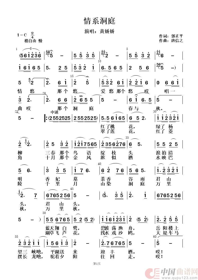 经词、曲作者同意歌谱上增加了演唱者名字。歌谱稍修改。关于《情系洞庭》曲谱的评论