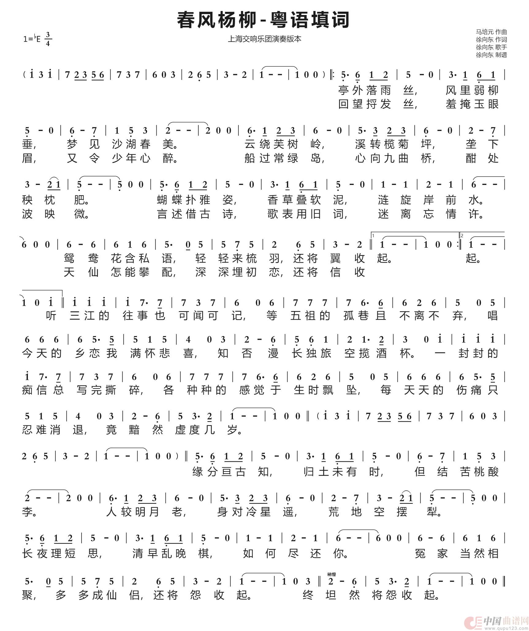 马培元作曲,上海交响乐团演奏的“春风杨柳”,我从少儿时期就喜欢听了,带着我浓浓的乡愁。长大后,这感觉挥之不去,2016年我用粤语试填词,下载了原曲做伴奏,试唱一下,近日通过腾讯音乐人TME改编正版音乐渠道发布。这里制谱以供歌友演唱。