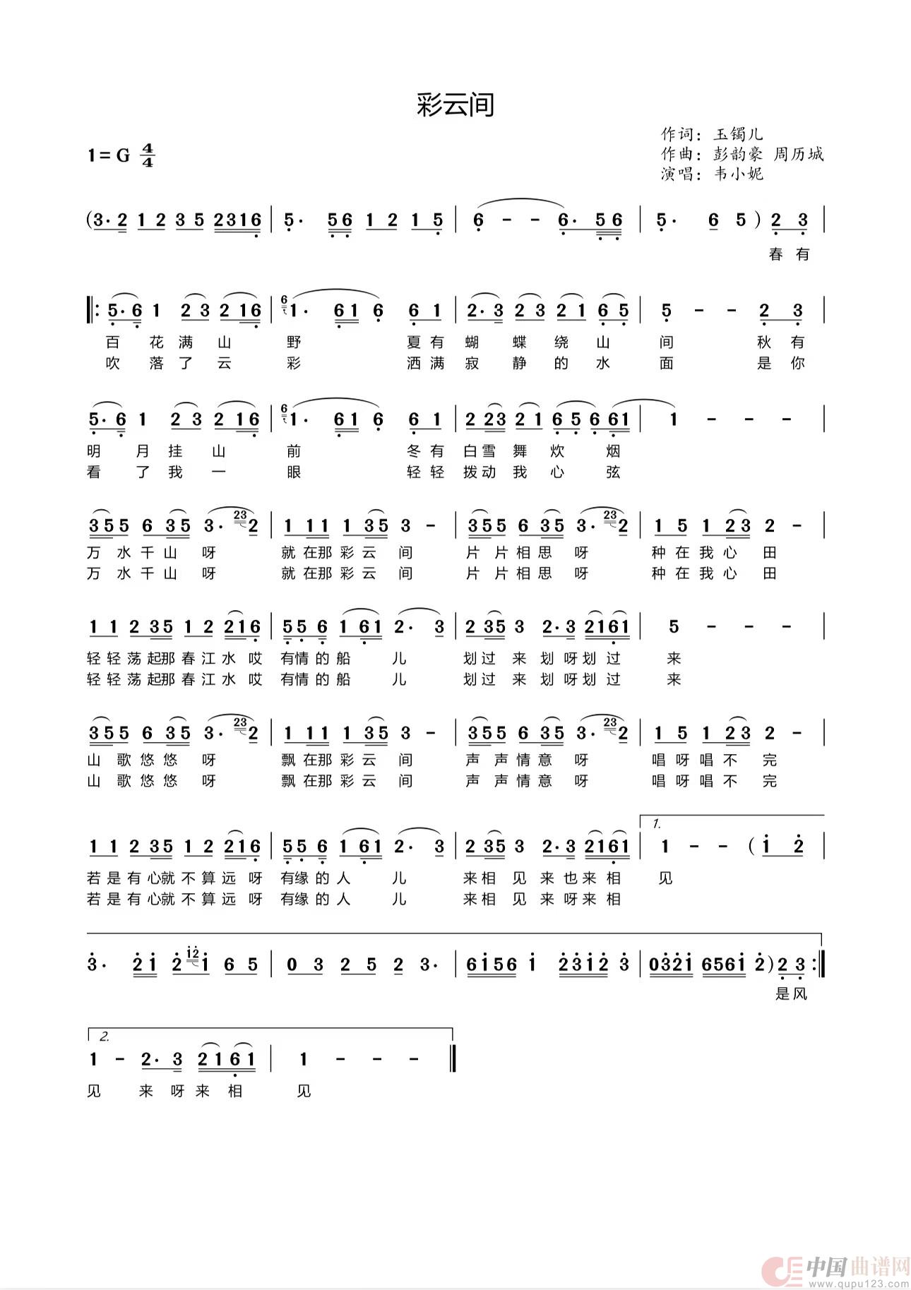 韦小妮原唱歌曲《彩云间》曲谱,简谱