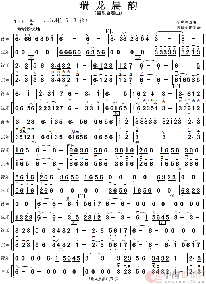 《瑞龙晨韵》器乐合奏曲谱是成都市龙泉驿区大面街道瑞龙社区旭东乐队(退休老年人业余乐器爱好者)排练和义务演出的曲谱。由该乐队艺术总监李声璋先生改编,由该乐队二胡琴师凤仪李鹏(金翅大鹏)制谱。
