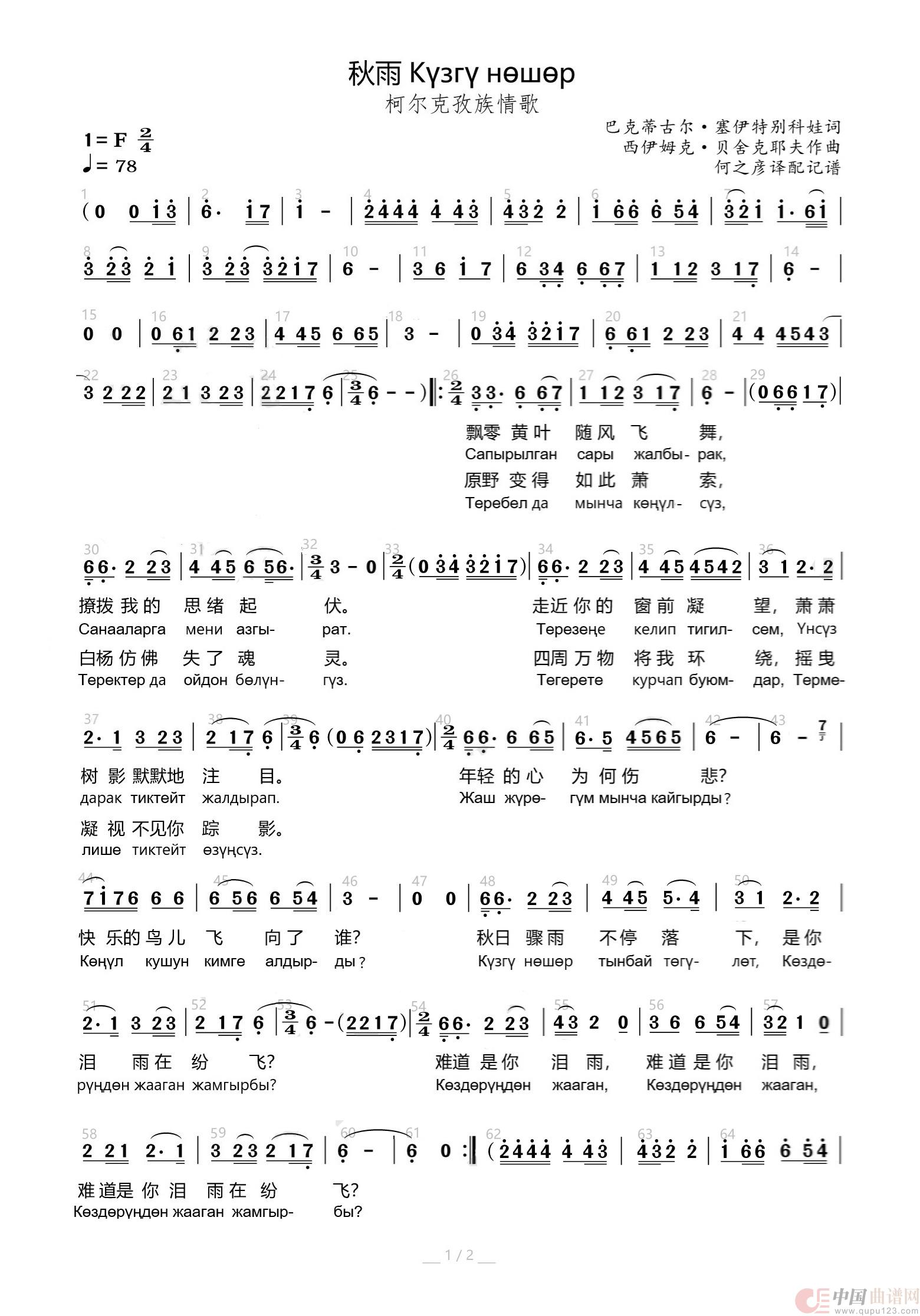 关于《秋雨Күзгү нөшөр》曲谱的评论