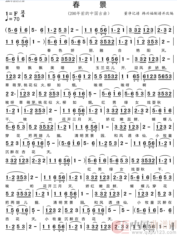 董净记谱:《春景》是大约道光初年古曲 ,原是一首琴歌,出自于《抄谱琴谱》里,后被收录于王迪先生的《弦歌雅韵》中,原去名为《四大景》,另一曲相似曲名为《春景》,此版本两首合参稍作改编而成。