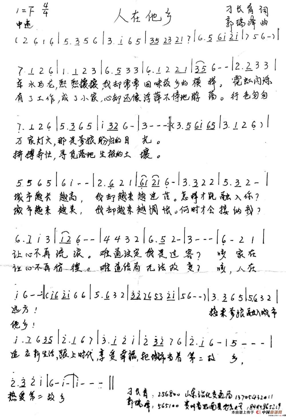 当前位置: 首页 谱友园地 手稿谱区 人在他乡(刁长育词 郭瑞峰曲)
