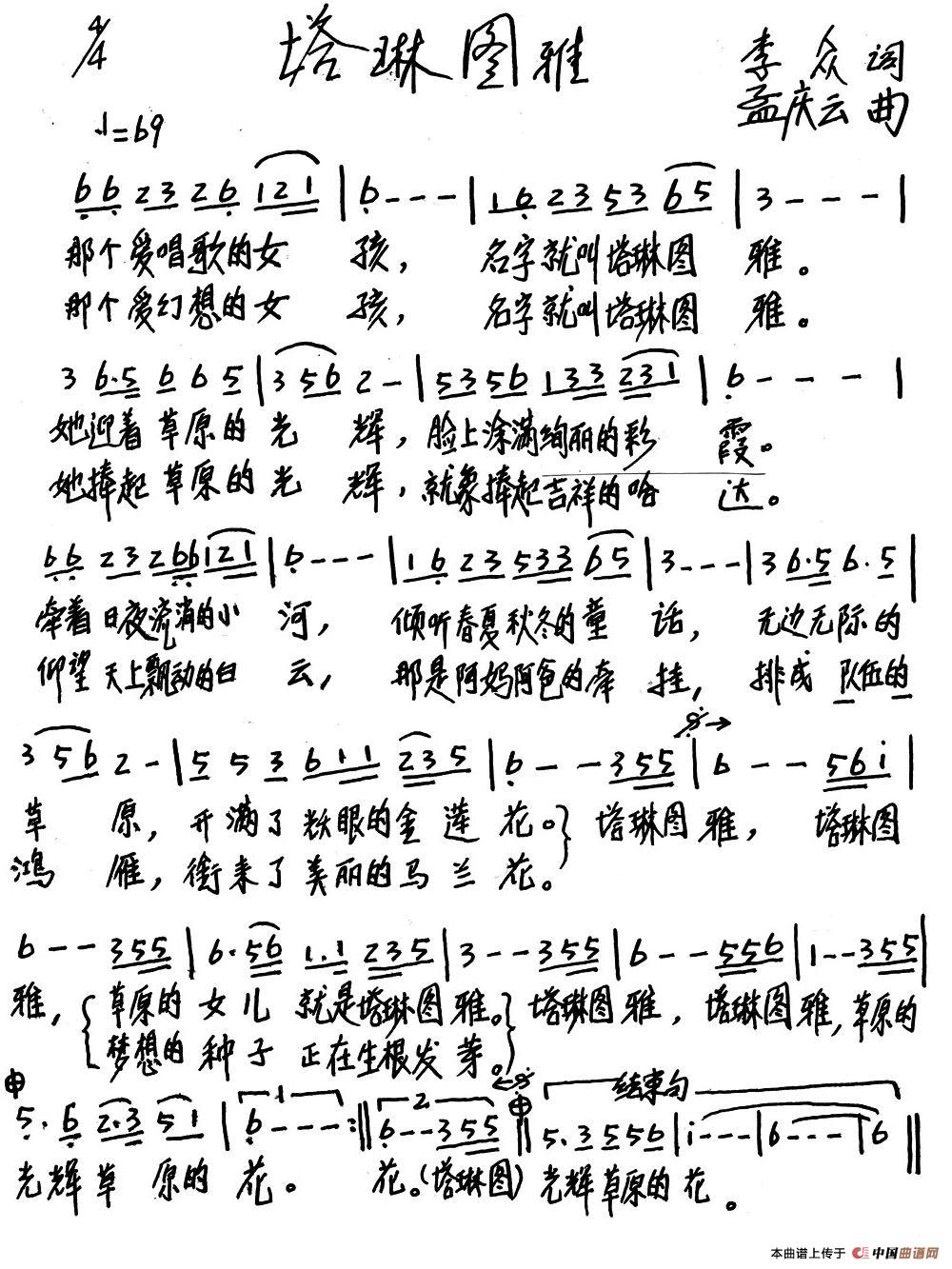 (白:草原有个爱唱歌的女孩,她的名字就叫塔琳图雅。)
