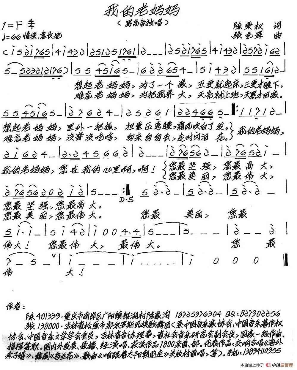 致谢:《中国曲谱网》衷心感谢作者老师馈赠原版歌谱!