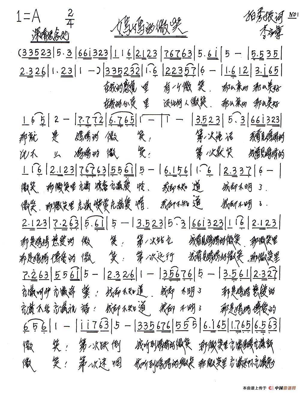 当前位置: 首页 谱友园地 手稿谱区 妈妈的微笑(柏秀振词 李应军曲)