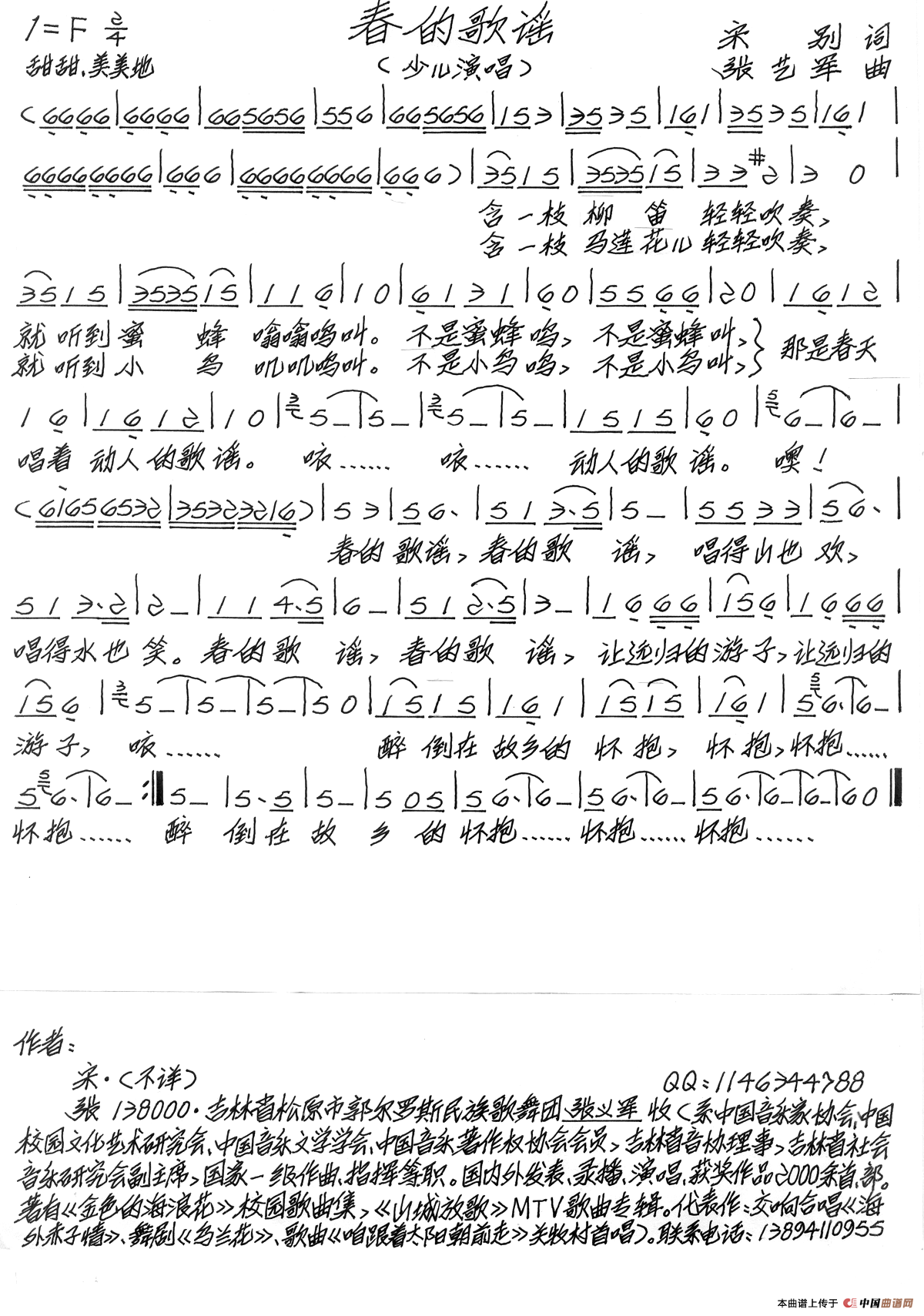 致谢:《中国曲谱网》衷心感谢作者老师馈赠原版歌谱!