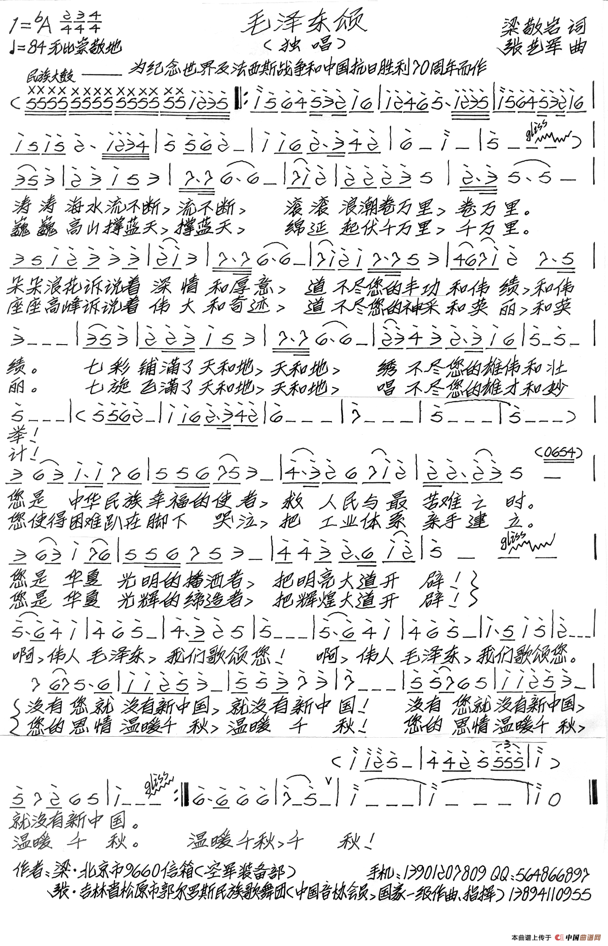 致谢:《中国曲谱网》衷心感谢作者老师馈赠原版歌谱!