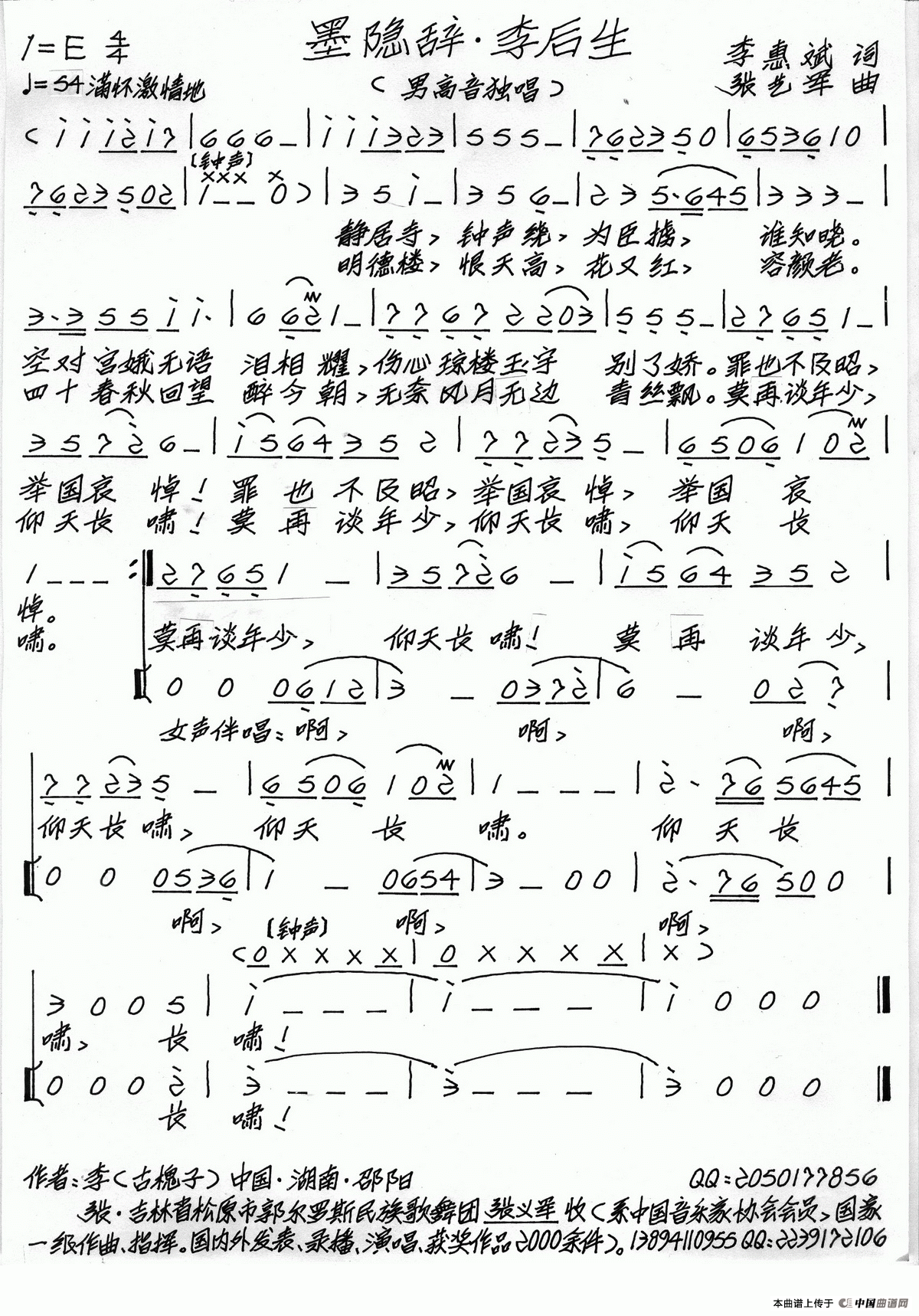 致谢:《中国曲谱网》衷心感谢作者老师馈赠原版歌谱!