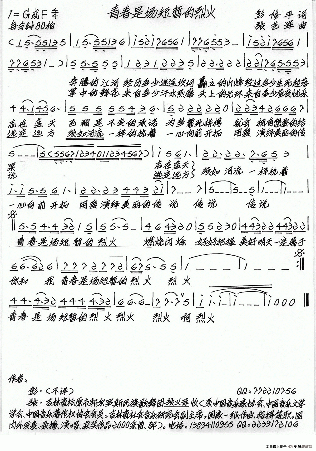 致谢:《中国曲谱网》衷心感谢作者老师馈赠原版歌谱!