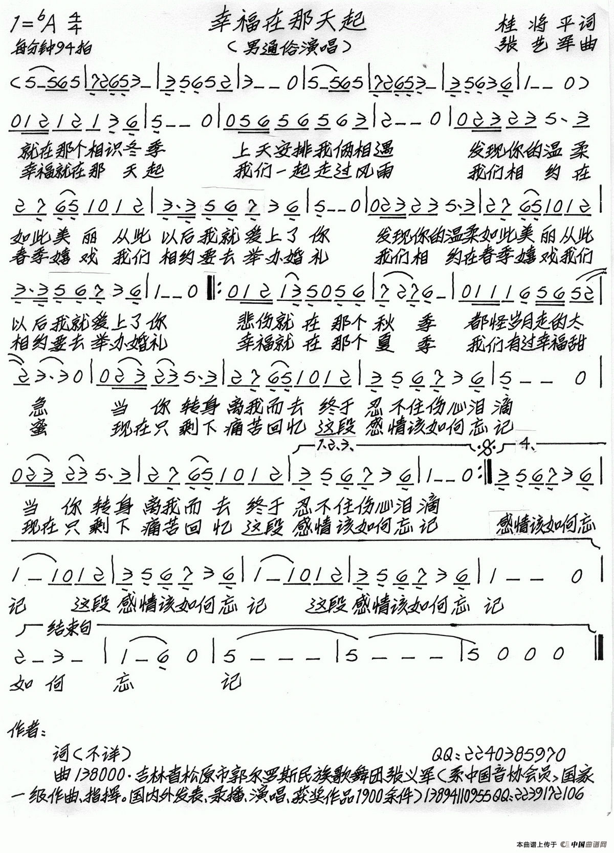 致谢:《中国曲谱网》衷心感谢作者老师馈赠原版歌谱!