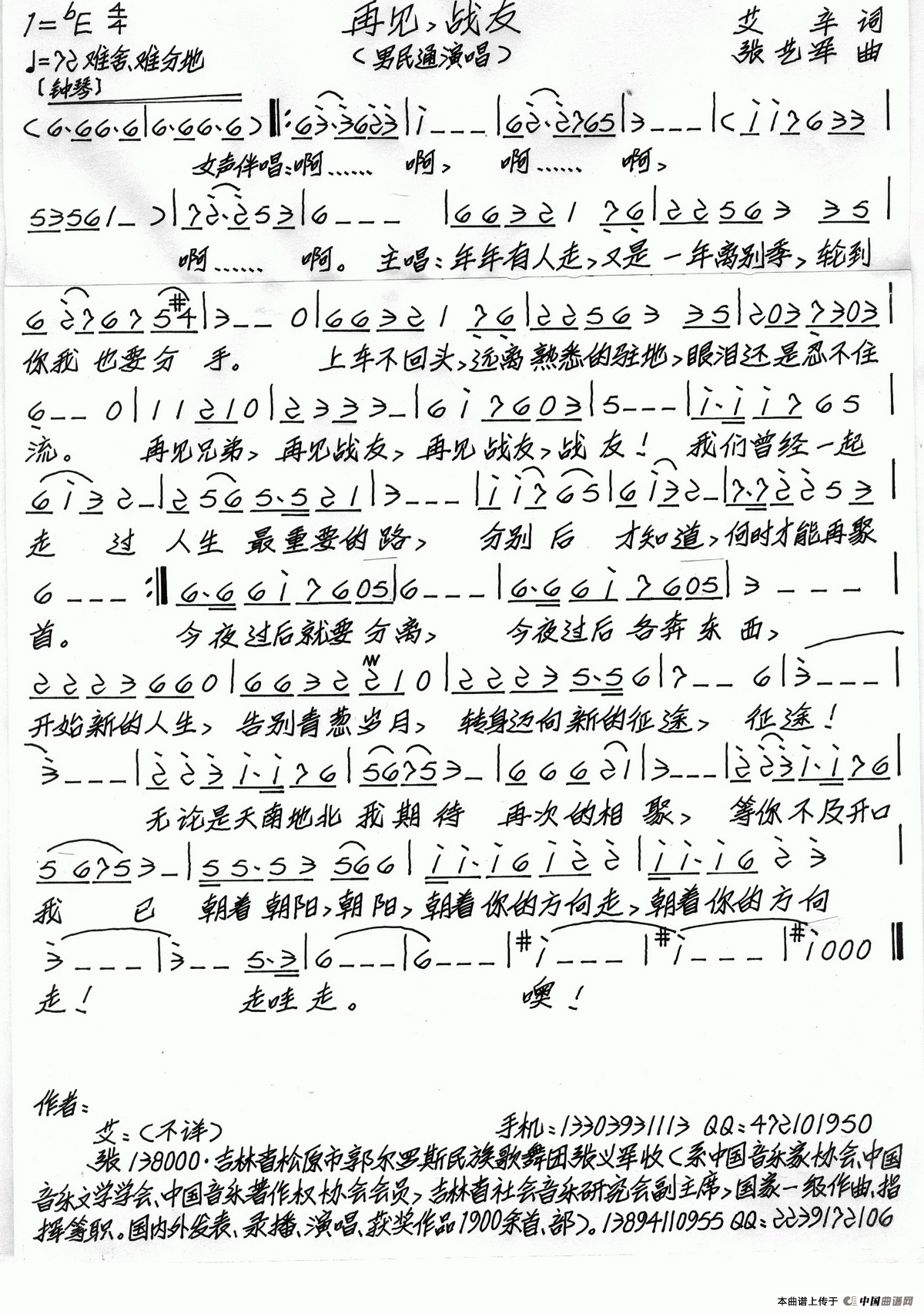 致谢:《中国曲谱网》衷心感谢作者老师馈赠原版歌谱!