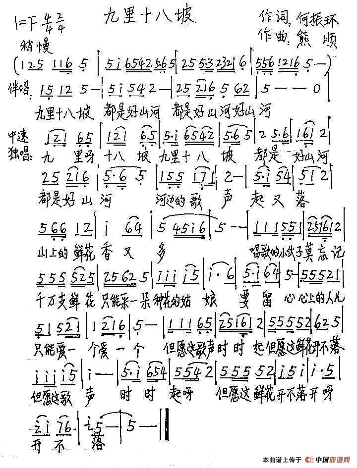 曲作者说明:词作者何振环1956年将自己作词作曲的歌曲《九里十八坡》投稿到音乐刊物《长江歌声》,在发表时,编辑只用了他的词,曲子是大作曲家郑律成所写。1957年,他被打成右派后精神失常,后虽平反,无法上班,天天在外面游荡,自言自语,时不时傻笑。有一年夏天的深夜,他误入了当地党委书记的房间,被人武部门的同志抓住,怀疑行刺被捆绑,当时有人认出他是某校教师,于是电话传来校领导,经证实,他的确是个疯子,是废人,又没有搜出任何凶器,就把他放了。以后听说他落水而亡。他已故去50多年,但他的这首歌词我仍记忆犹新。今天我为它重新谱曲,以表对不幸早亡歌友的同情与怀念。