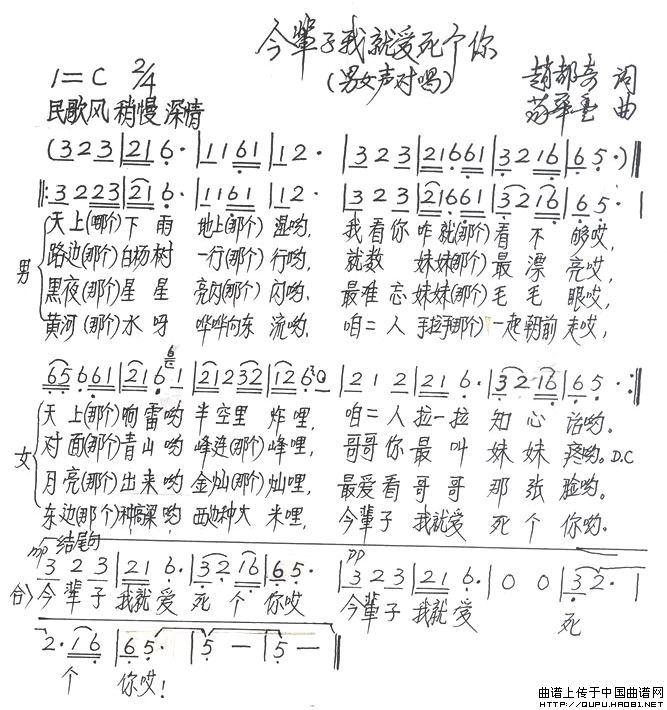 当前位置: 首页 谱友园地 手稿谱区 今辈子我就爱死个你(赵都奇词 苟华丰曲)
