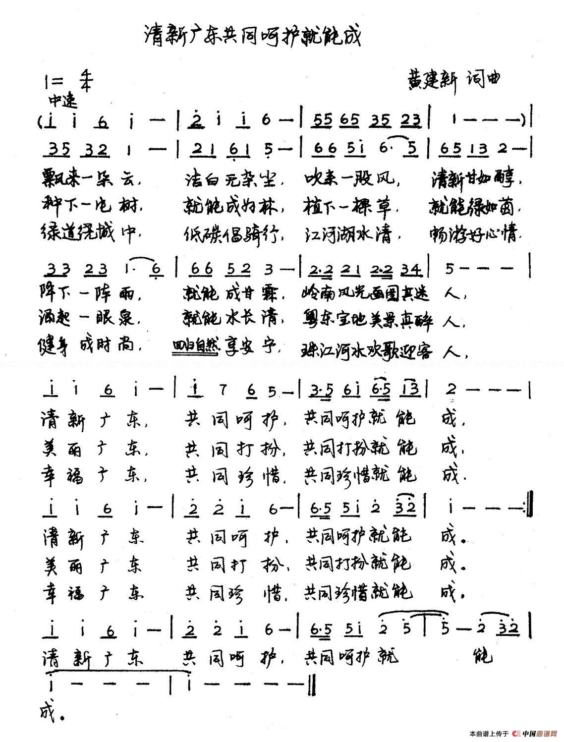 作词:黄建新 作曲:黄建新 格式:简谱 来源:首届广东环境文化节歌曲作品展示 上传:秋叶起舞