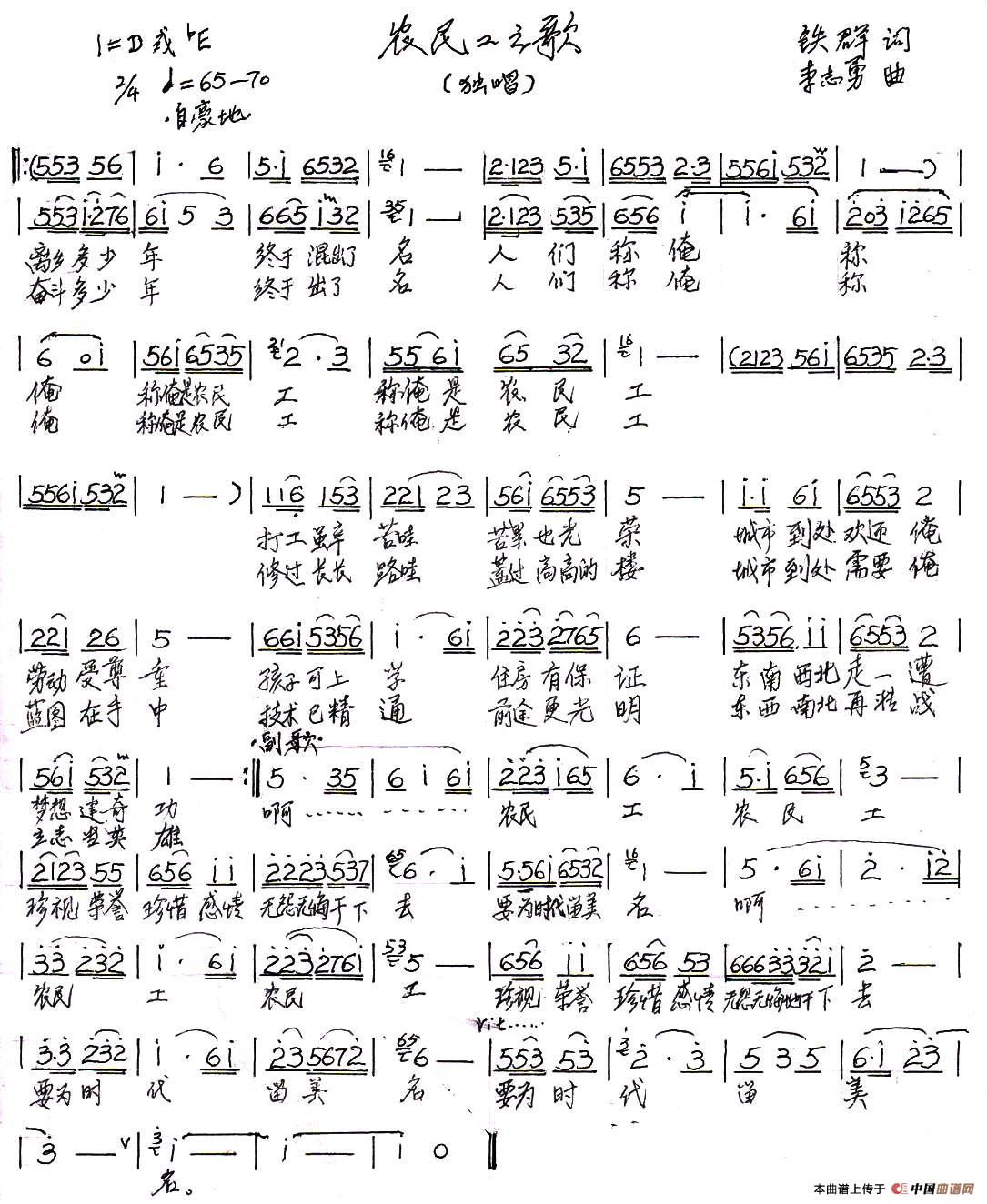 关于《农民工之歌》曲谱的评论