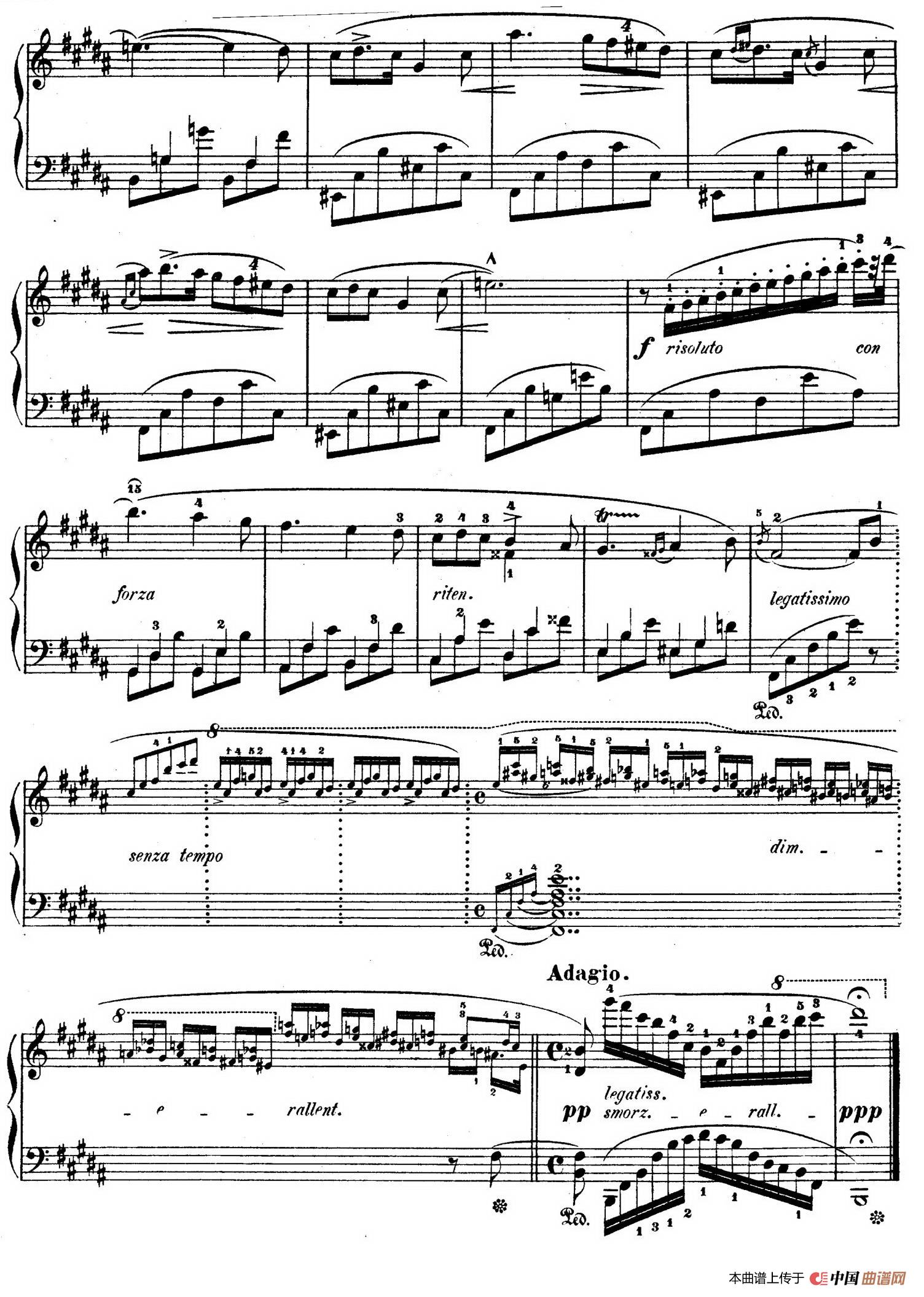 3. B大调夜曲 Op.9-3,作于1830-1831年,稍快板,6/8拍,三段体。从速度标记上可以看出,这不是一首梦一般的夜曲,而是具有快活诙谐性格的暗示。第一段优雅而带几分媚态;第二段转为b小调,激烈的戏剧性情绪,有进行曲风格旋律;第三段再现第一段后有优美的尾声。尼克斯评价:“典型的沙龙音乐,没有爱怜,在情绪上却充满馨香。”