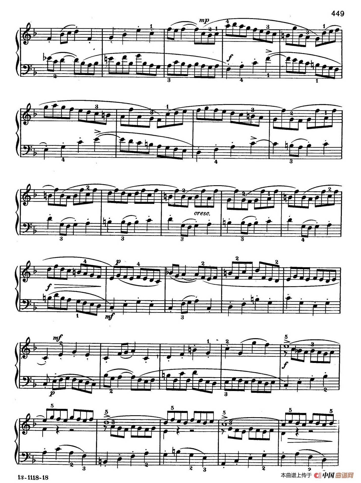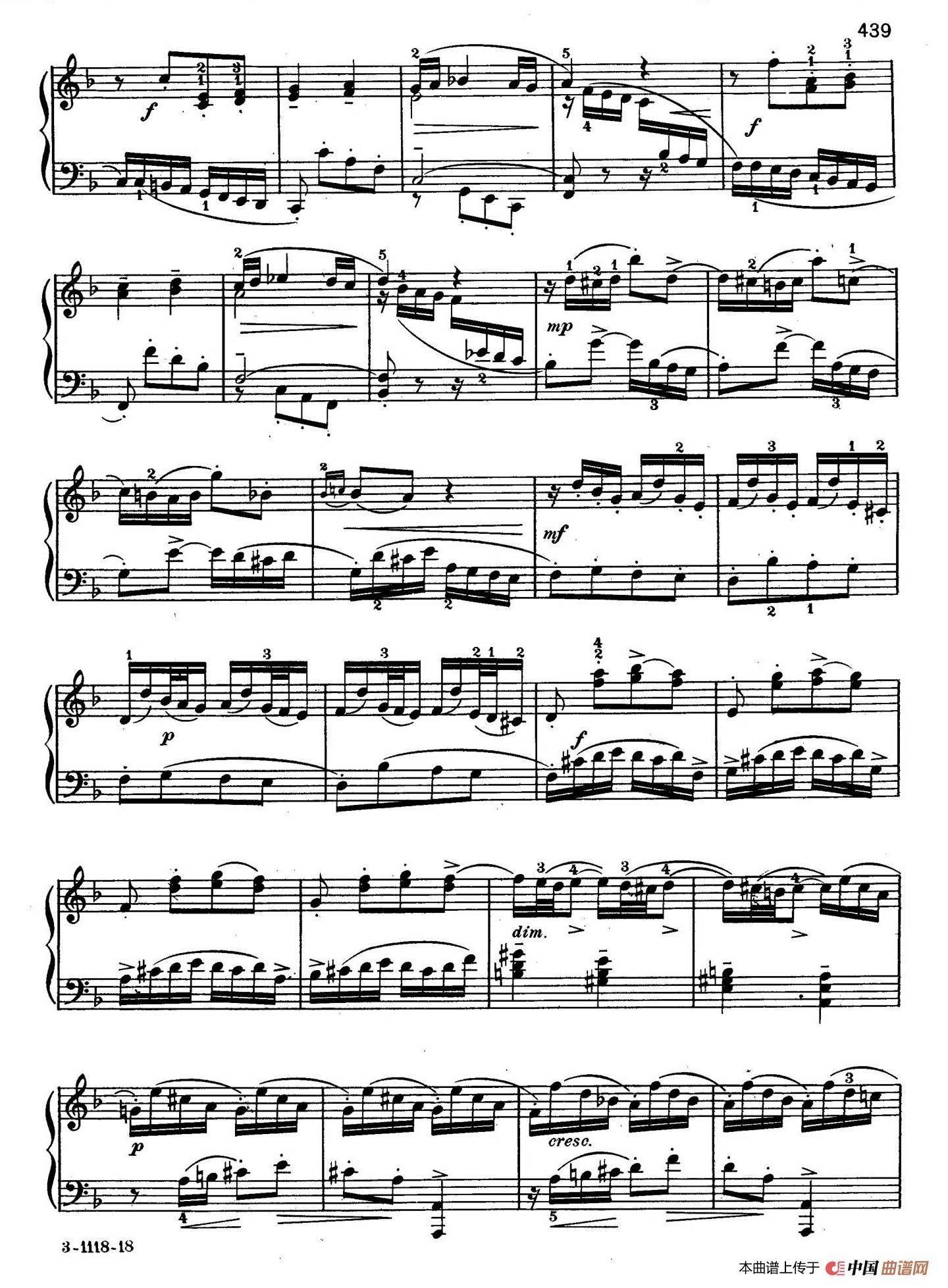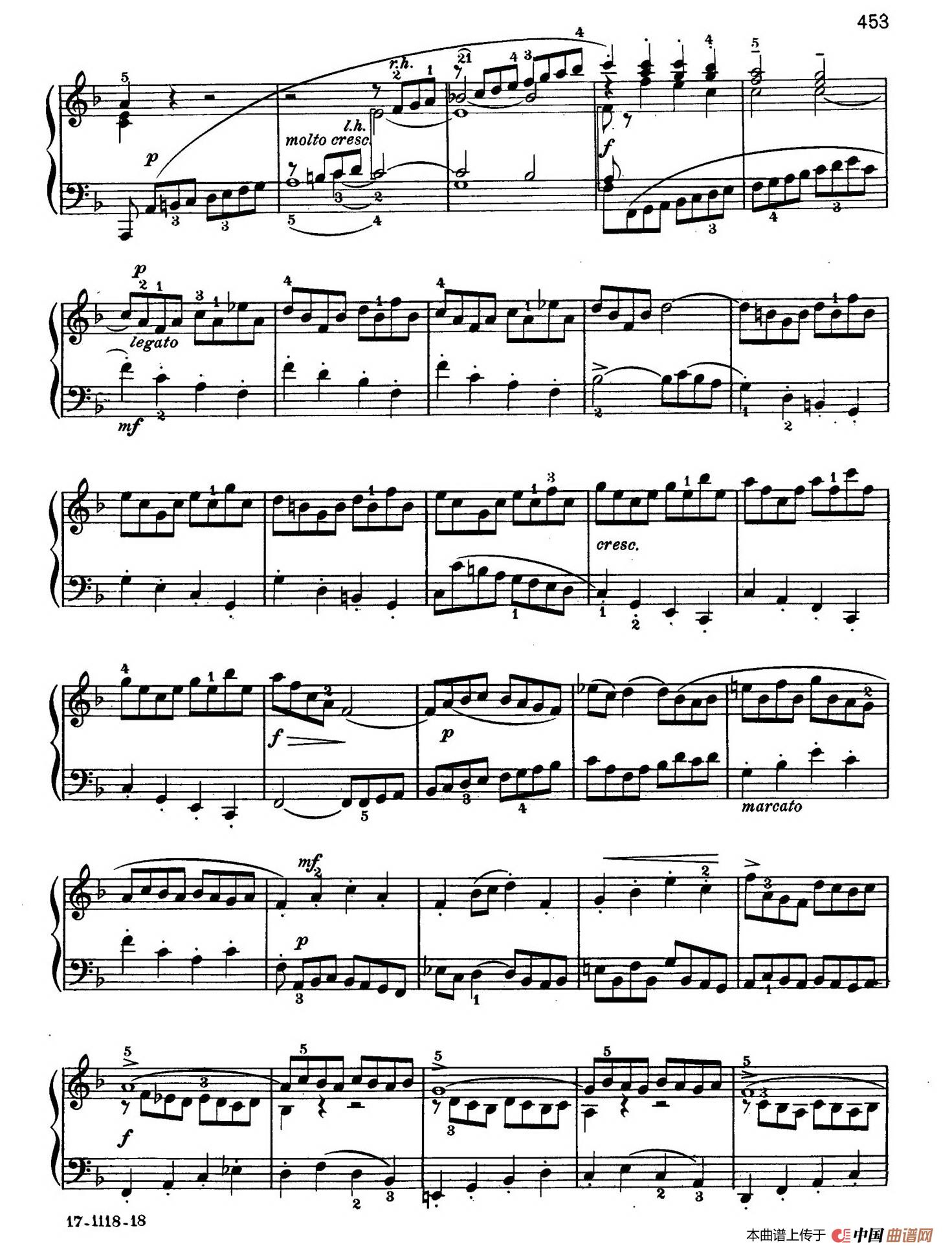 第三乐章,急板,又转回F大调,回旋曲风格,交互配置合奏与主奏,形成复杂而丰富的协奏效果。
