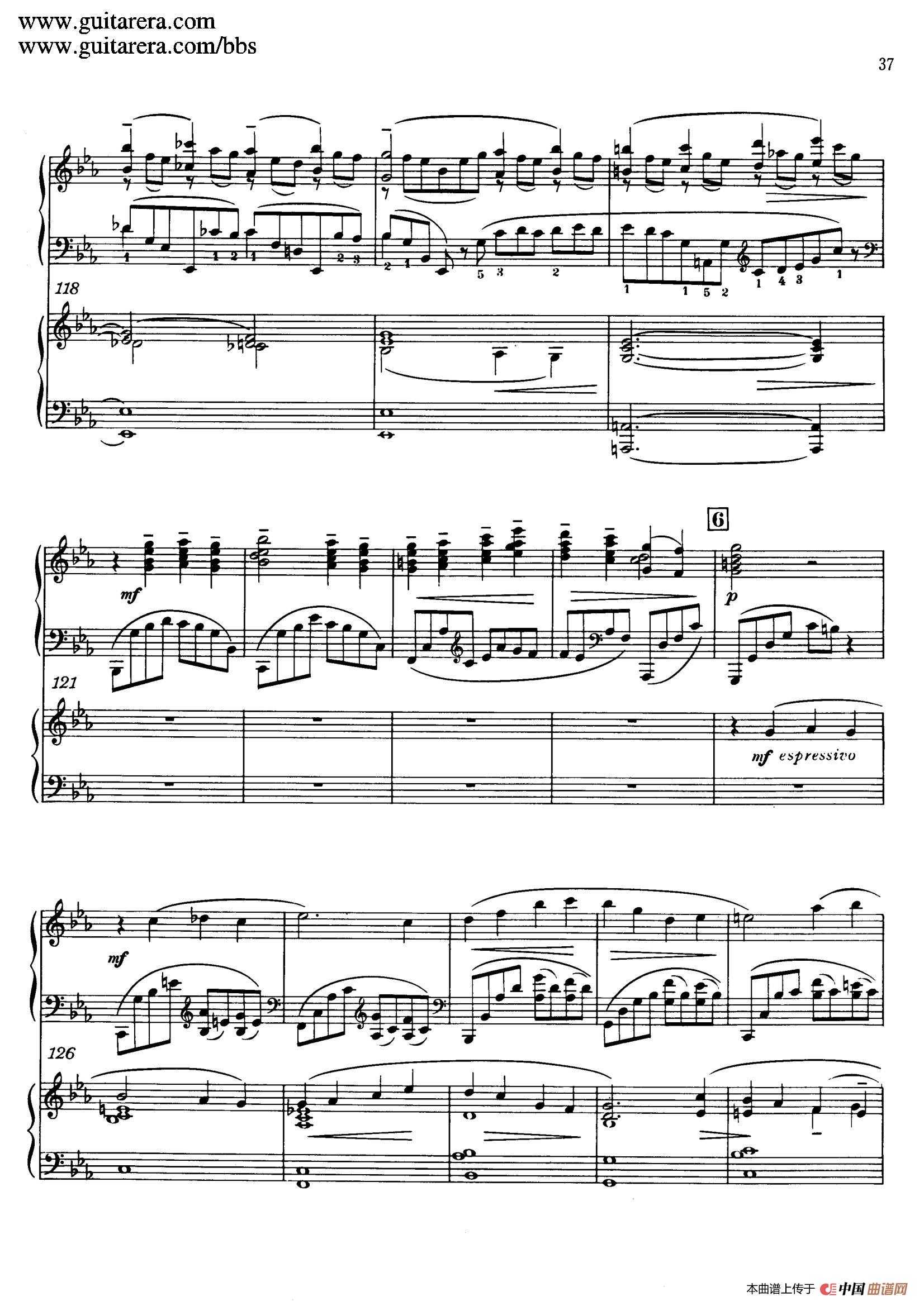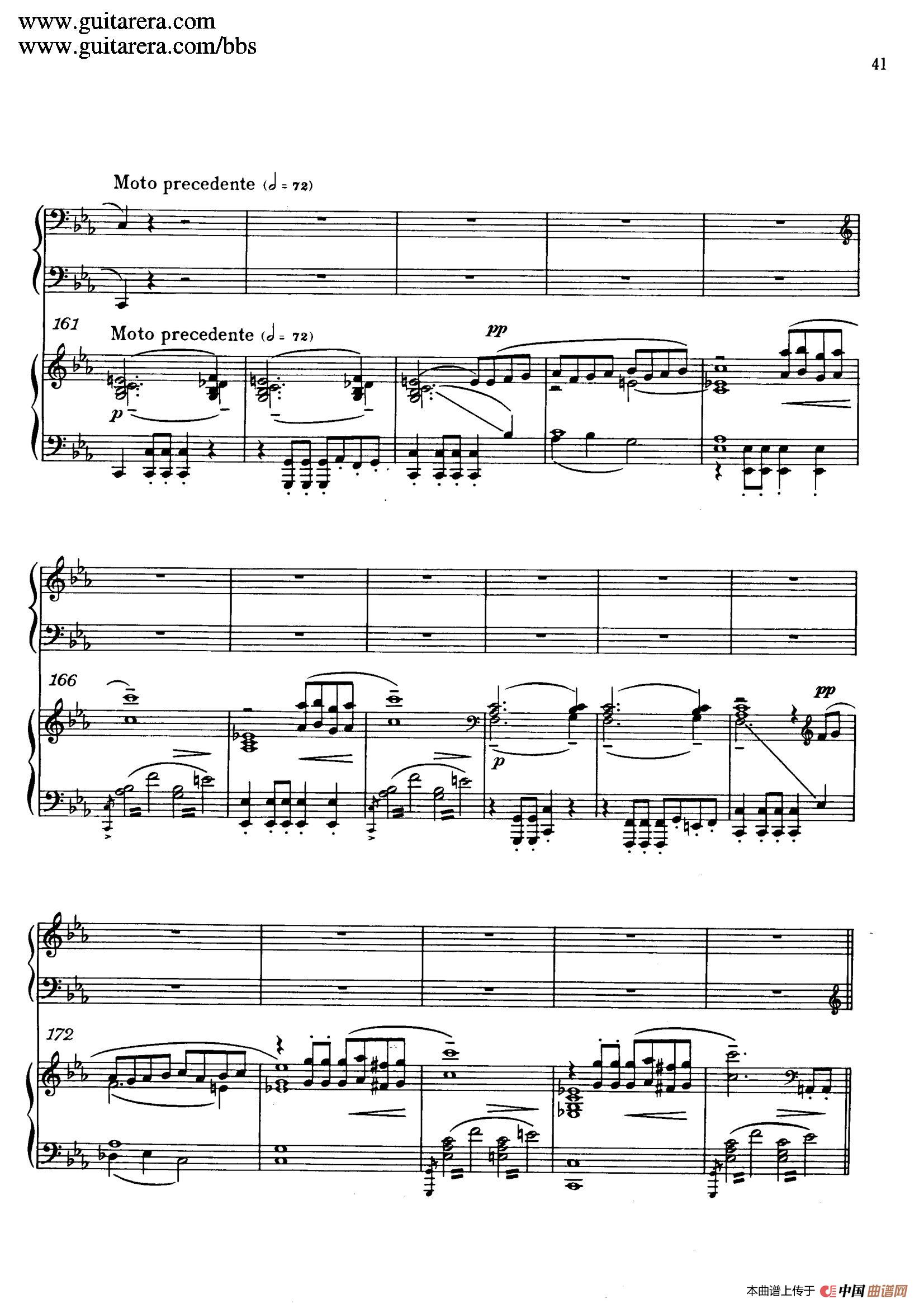 第一乐章中板,c小调,2/2拍子,奏鸣曲形式。从一段简短的引子开始。这段引子相当特别,它尽是一些和弦,由钢琴独奏奏出,它的音响从倍弱一直发展到倍强,像喑哑沉闷的钟声一般,缓慢均匀而庄严,具有号召性的力量,正如俄罗斯作曲家梅特涅尔(H. K.MeTHep, 1879-1951)所说,“每当第一下警钟声响,你就会感到整个俄罗斯跃然奋起。”这段引子为乐章第一主题的出现充分做好了准备。现在,钢琴以其沸腾般的波浪音型充作背景,这时候出现的第一主题,旋律进行从容不迫,从中可以感到傲然的欢呼、史诗般刚毅的性格、不可战胜的力量和奋激的热潮:它有时带有严峻的气质,有时又像抑郁的沉思一般。这支旋律气息宽广,开头的音调有着充足而丰富的发展,但在这里歌唱性的发挥又完全服从于坚定、权威的节奏,从而在一定程度上具有颂歌和进行曲的色彩,它那巨大的步伐几乎全部交由乐队加以体现。