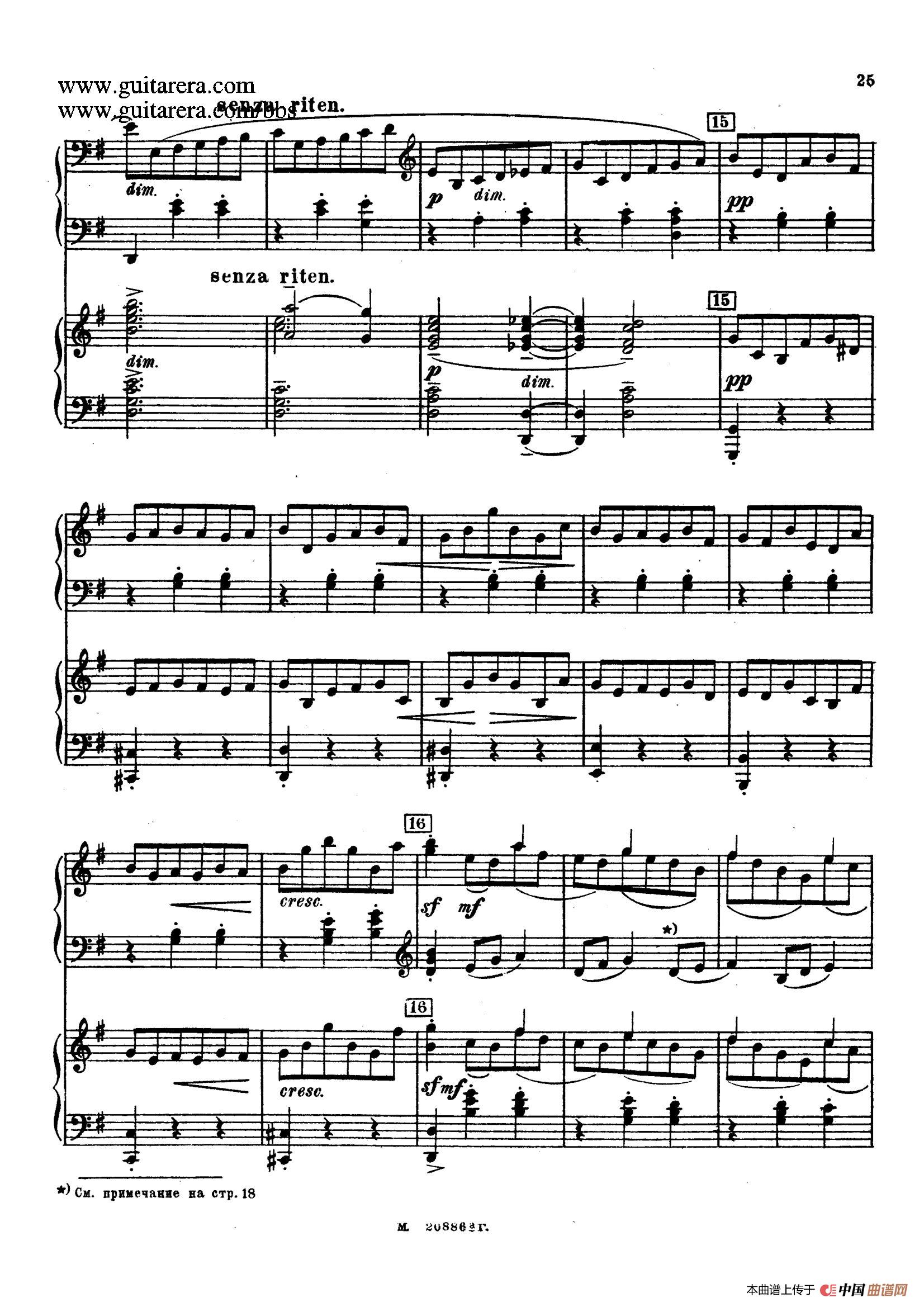 2. 圆舞曲 Valse G大调,急板。第二钢琴奏响起始和弦,之后第一钢琴就以极快的速度奏出颤音,第二钢琴承接主旋律,旋律是欢快的典型俄罗斯风味的圆舞曲。在之后便进入抒情乐段,由第二钢琴奏出低音快速部分,第一钢琴表现出抒情的第二主题,之后便回到第一主题,在高音部结束。