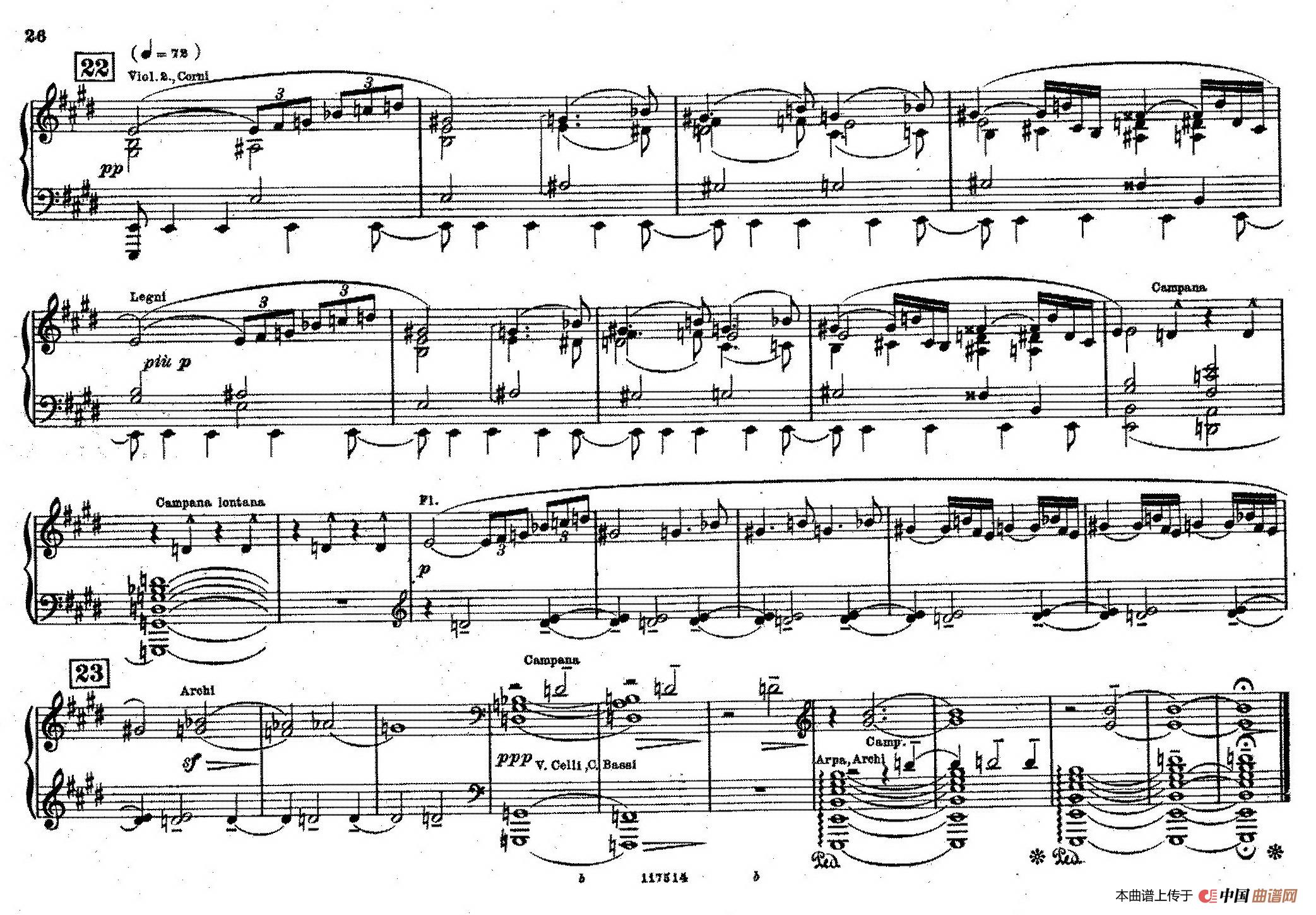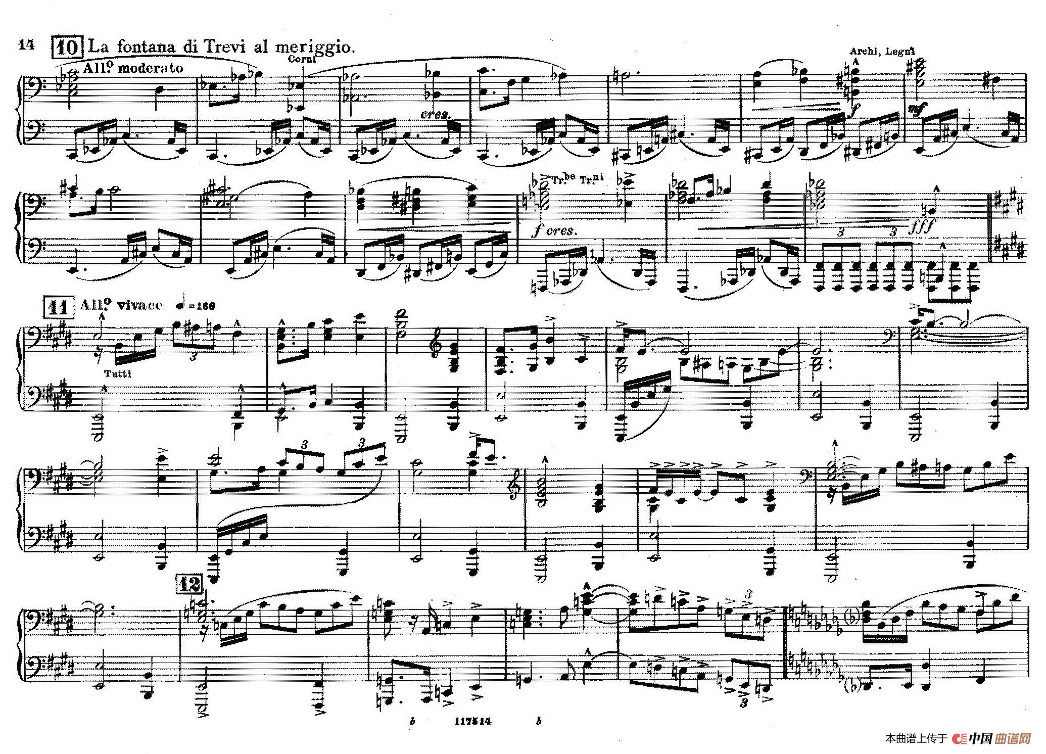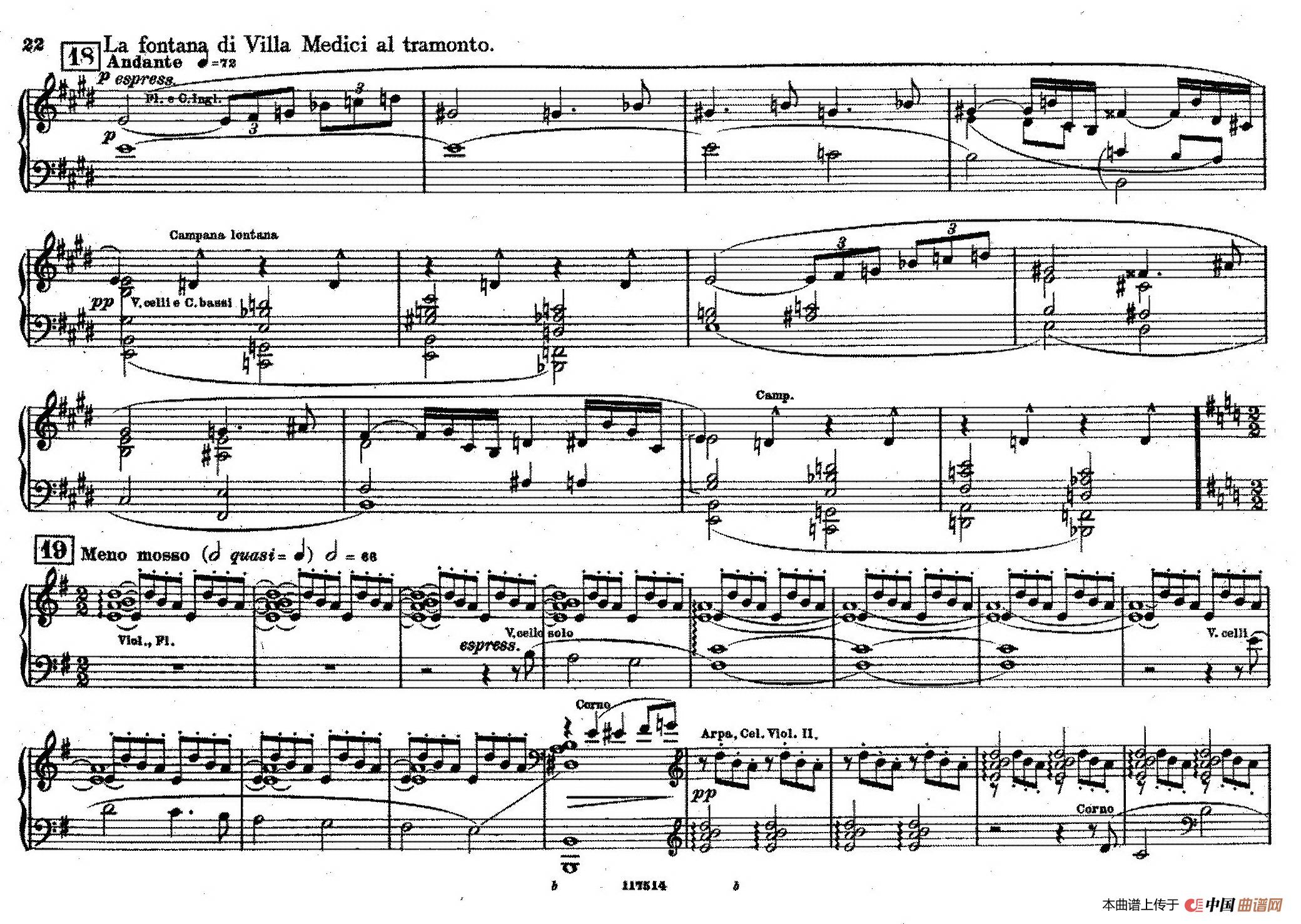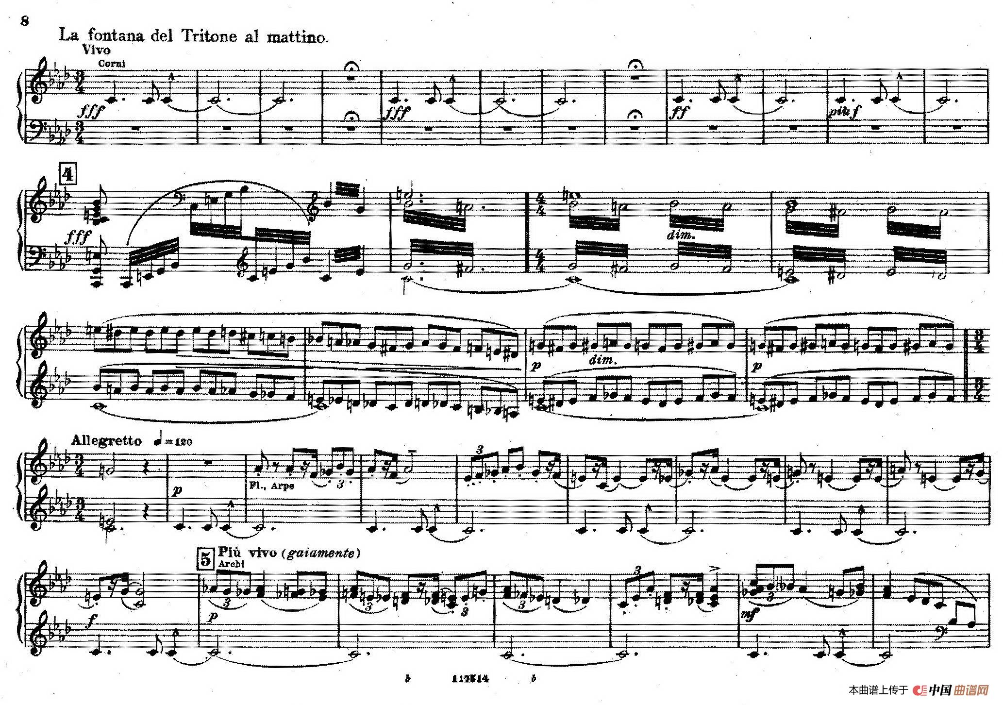 第四乐章“黄昏时梅迪契别墅的喷泉”La fontana di Villa Medici al tramonto 。这一乐章的音乐带有非凡暖和而感伤的情调。乐章开始时的背景音乐是泉水叮咚的绝妙写照,在这种富有诗意的氛围之中,升起了一支忧伤的旋律,这就是代表落日时思乡情感的主题。