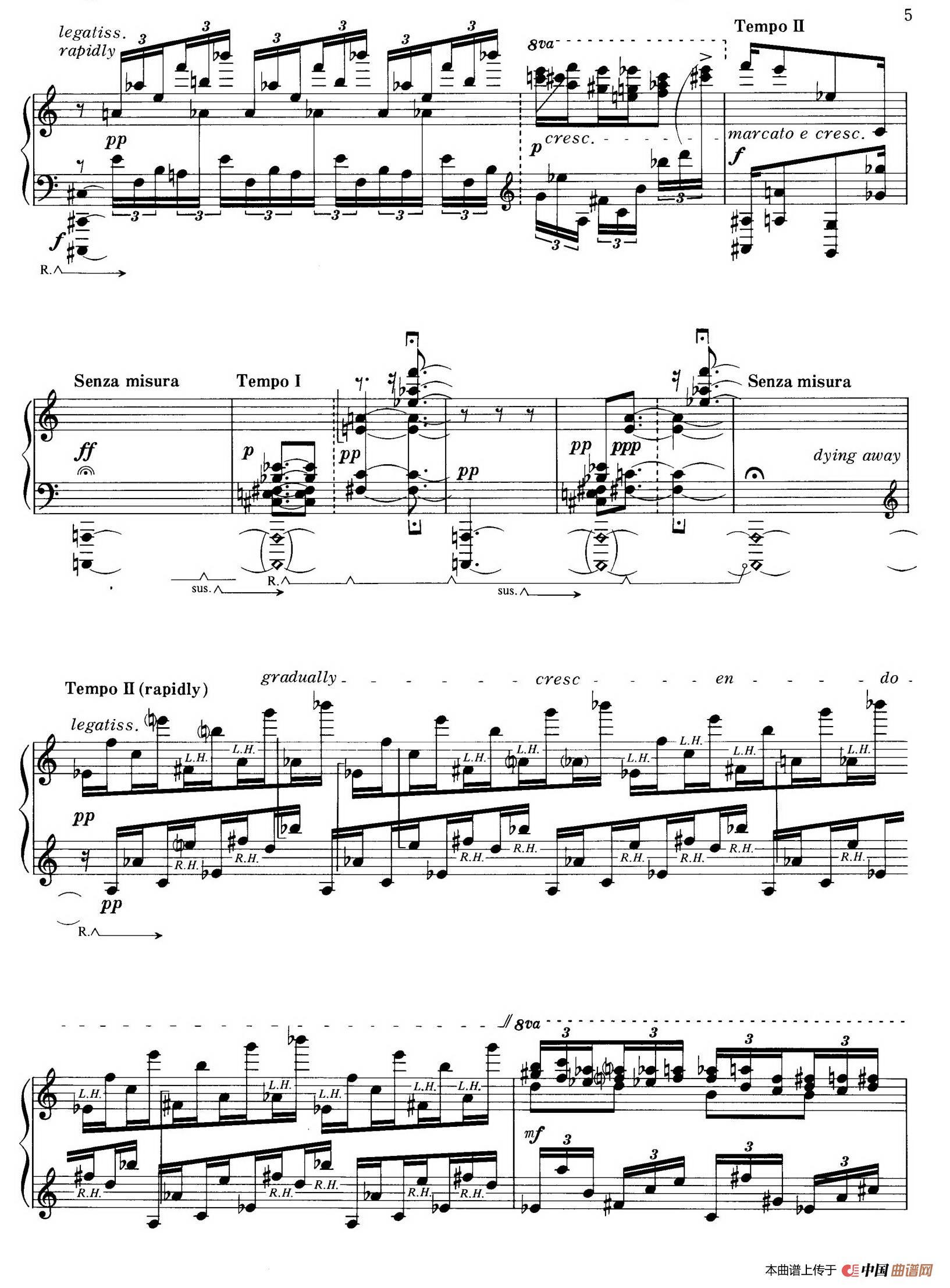 这首《雨树素描》给人们带来的是令人愉快的水滴的印象,双手大部分时间都在高音区轻柔地弹奏。作品中还有不少形态各异的重音及延长音记号,演奏时应注意分辨其区别(具体请看乐谱附带的解说)。