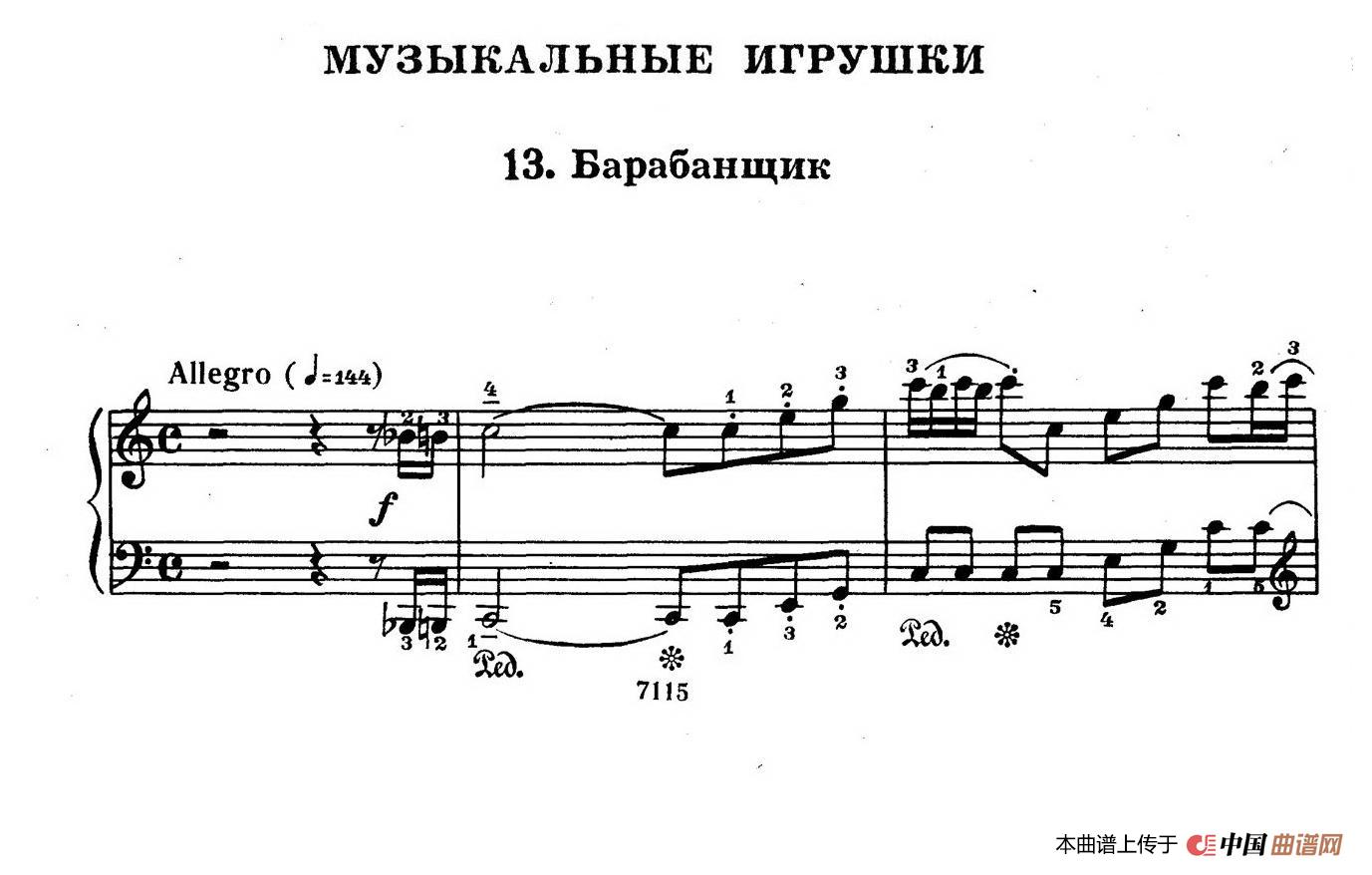 《音乐小品》Musical Toys ,是古拜杜丽娜于1969年为她女儿而作的一部由十四首钢琴小画像组成的儿童钢琴曲集,可供儿童钢琴教学使用。这十四首小曲分别是:13. 鼓手 The Drummer,快板。