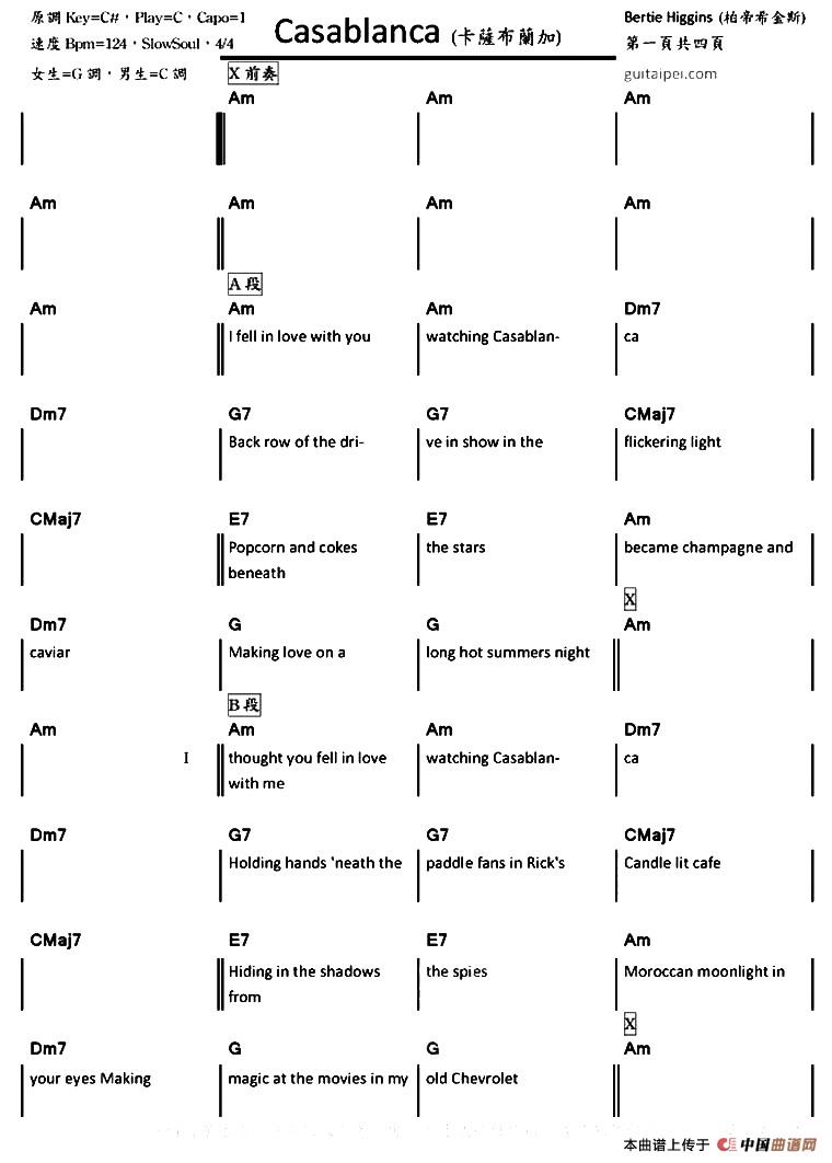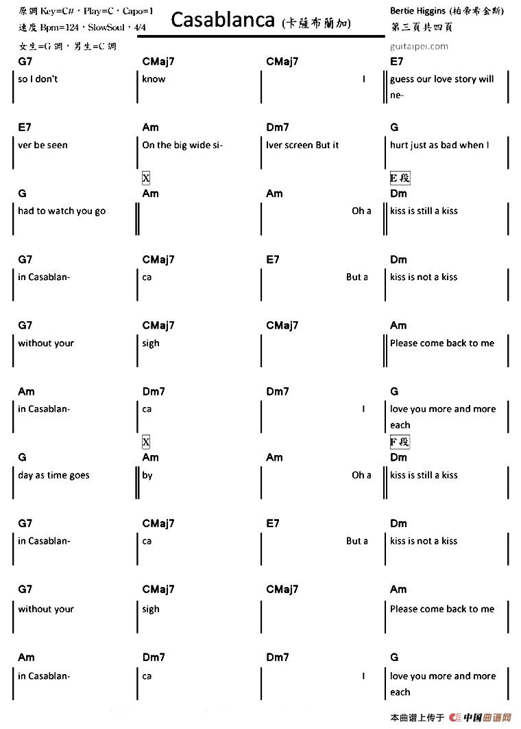 版本二:虹韵音乐娱乐编配版。Casablanca吉他谱,根据电影《北非谍影》而有感创作的歌曲,卡萨布兰卡吉他谱,原调C#,男生版C调,变调夹夹一品,女生调G调,参考节奏和节奏琴友们参考下方的图片谱。这首经典的英文歌曲Casablanca曲调优美,唱出了相爱之人无奈离别的心声和思念爱人追忆往昔的怀旧情绪。