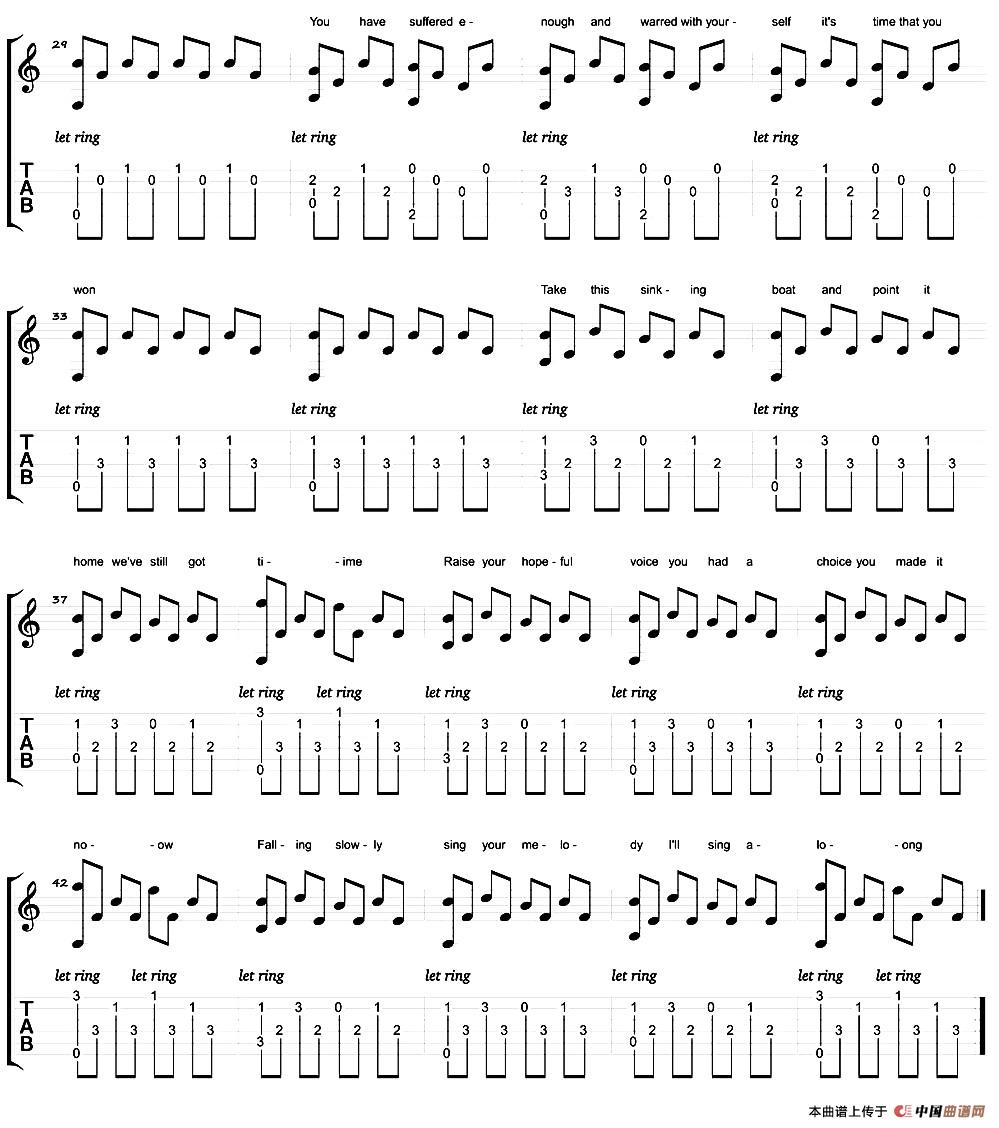 Falling Slowly吉他谱,六线谱编配,爱尔兰音乐电影《once》主题曲,在都柏林的一家乐器行里,男女主角第一次的共同演奏就是这首歌。歌曲以男声为主,饱含深情的吐露自己的心境,唱出无奈和心酸。在《Falling Slowly》歌声里仿佛欣赏了一场风景,吉他的随性弹拨,琴音流淌心间。男主角的浅吟底唱,娓娓道来自己的情愫。高潮处女声加入,又柔和了男声的沧桑。一首歌,唱出许多人的心声,值得一提的是该歌曲曾获得第80届奥斯卡原创歌曲奖。
