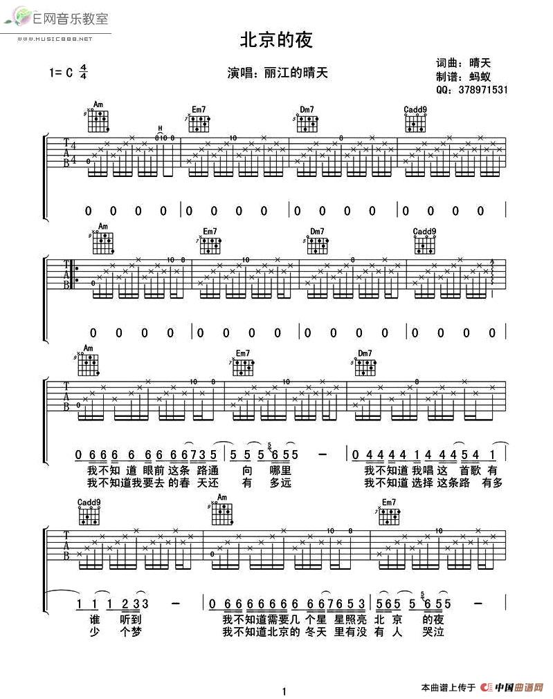 作曲:晴天词曲、蚂蚁制谱 演唱(奏):丽江的晴天 来源:转自《E网音乐教室》 上传:车里子