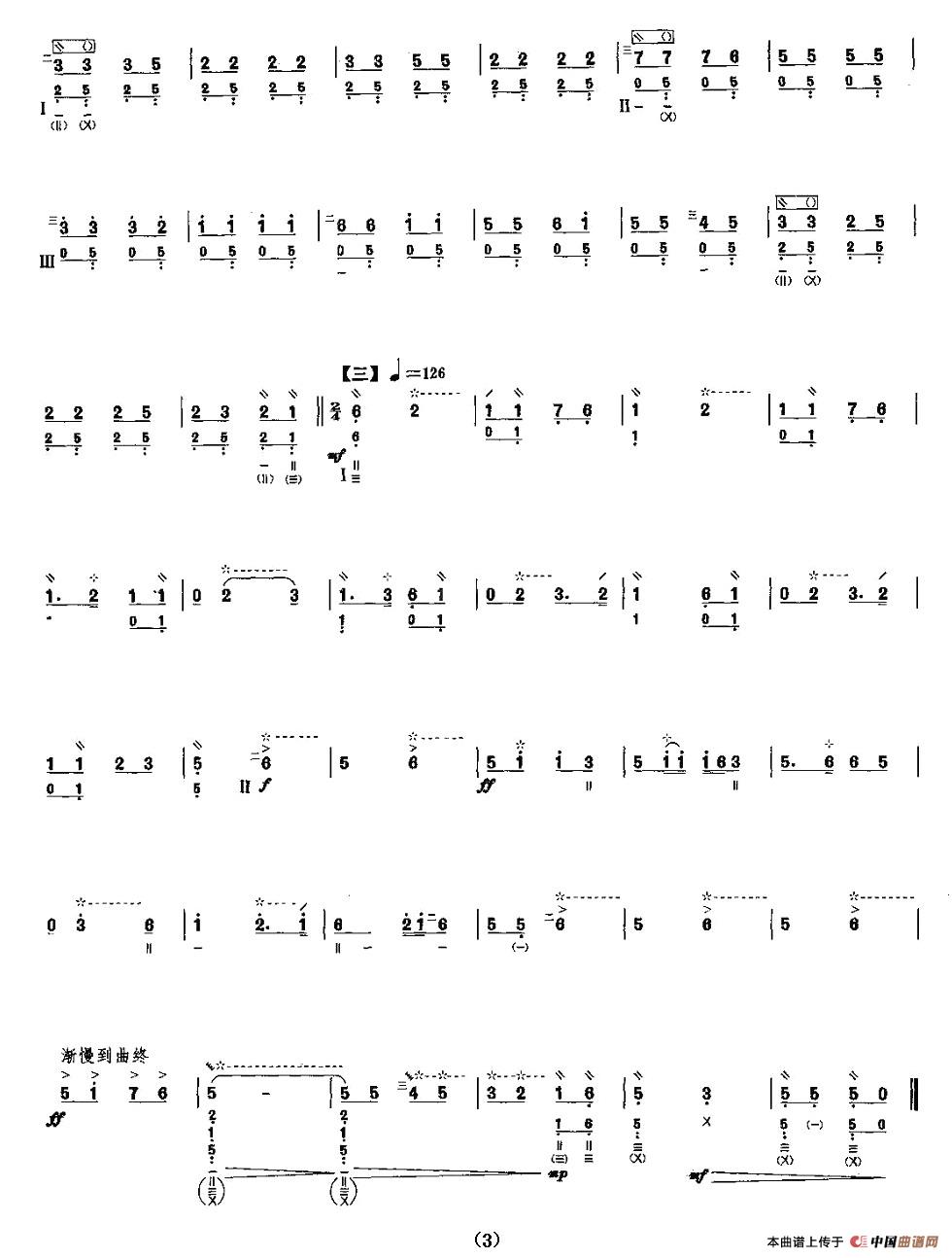 第三段速度更快,音乐取材于苏南民间音乐大唢呐曲《将军令》,铿锵有力的旋律和坚定的节奏,表现出一种坚强不屈的气质,乐曲在充满自信和乐观的气氛中结束。